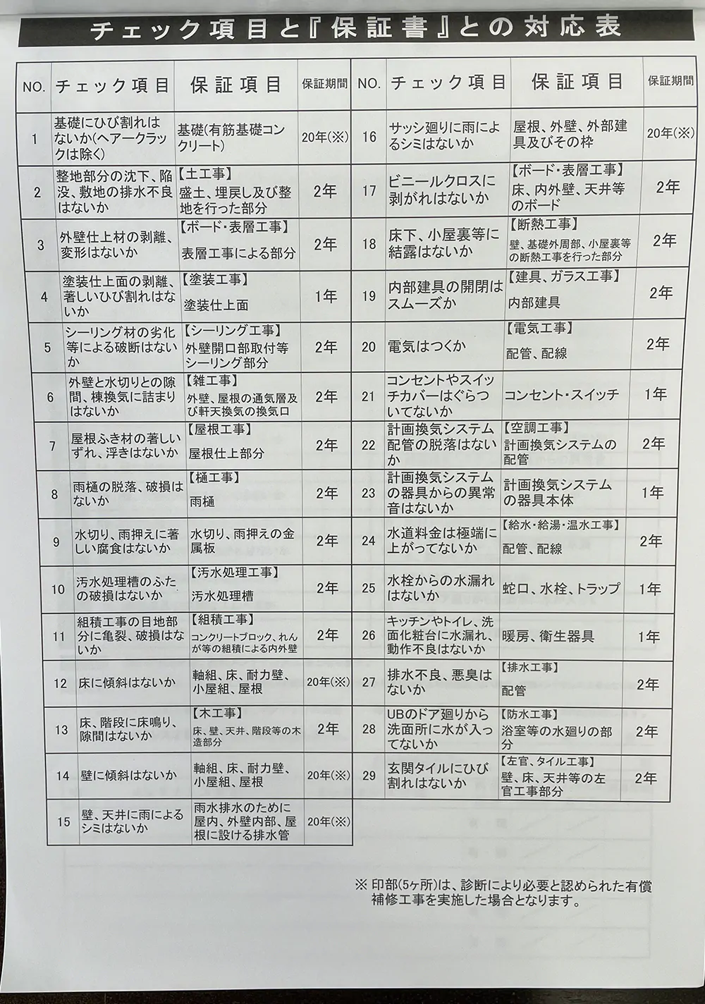 工事が完成し引き渡し後、万が一住宅が傾いたり、雨漏りしたりなど不具合が起きたという不足の事態に備えて、最長10年間、補修費用を保険でサポートする制度で、住宅品質確保促進法にも対応しています。さらに、10年目に当社指定のメンテナンス(有料)を実施することで最高20年間のロングラン保証に延長することができます。
