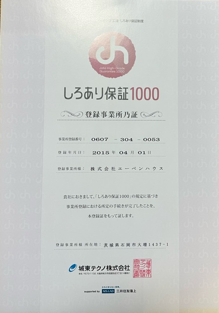 Joto基礎パッキン工法施工により竣工日より向こう10年間、白蟻による食害が発生した場合、最高1000万円が補償されます。それだけ防蟻性に優れた工法なのです。