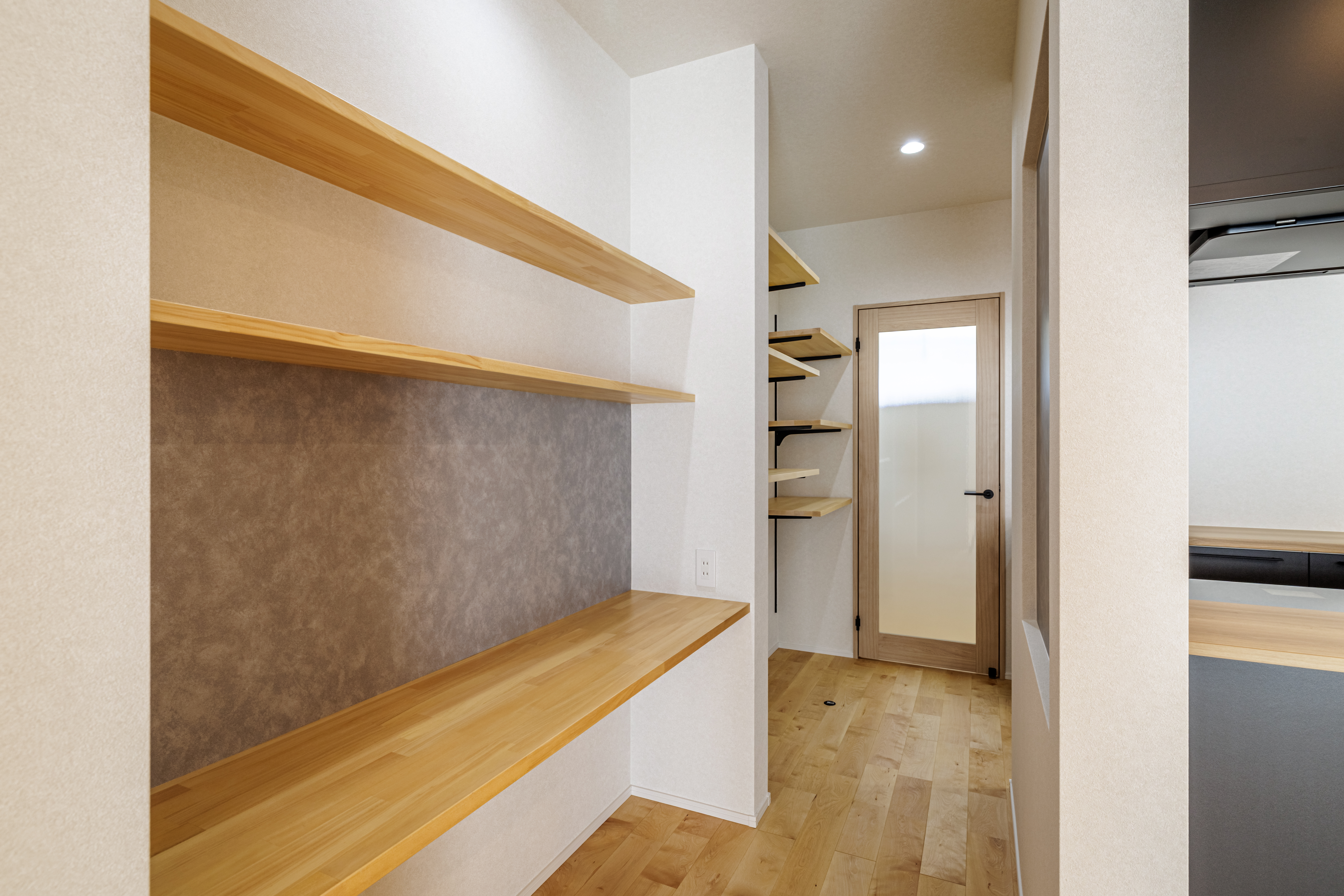 水廻りを回遊動線にしてスムーズに家事を行える間取りへ。大空間のランドリールームは室内干しや乾太くんも設置して洗濯家事を一気に効率化。