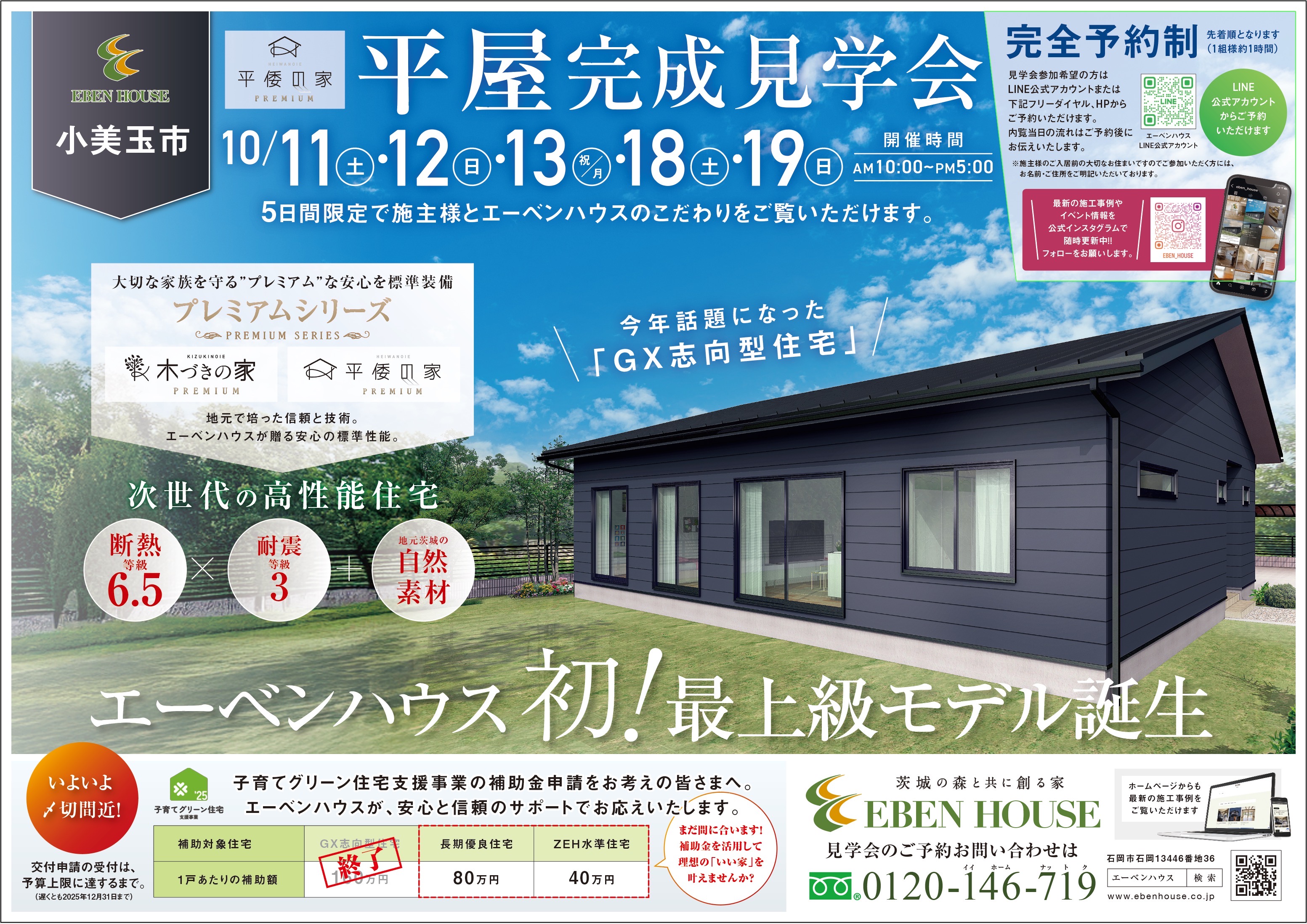 小美玉市【10月完成見学会】初のプレミアムシリーズ 10月11日(土)・12日(日)・13日(月・祝)・18日(土)・19日(日)