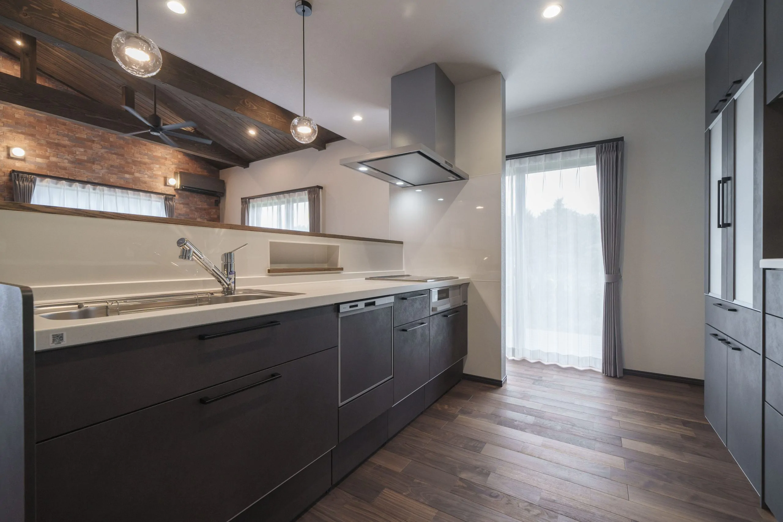 食洗器付き!カップボードと合わせ、収納には困りません。キッチン周りを回遊できるのでとっても便利!