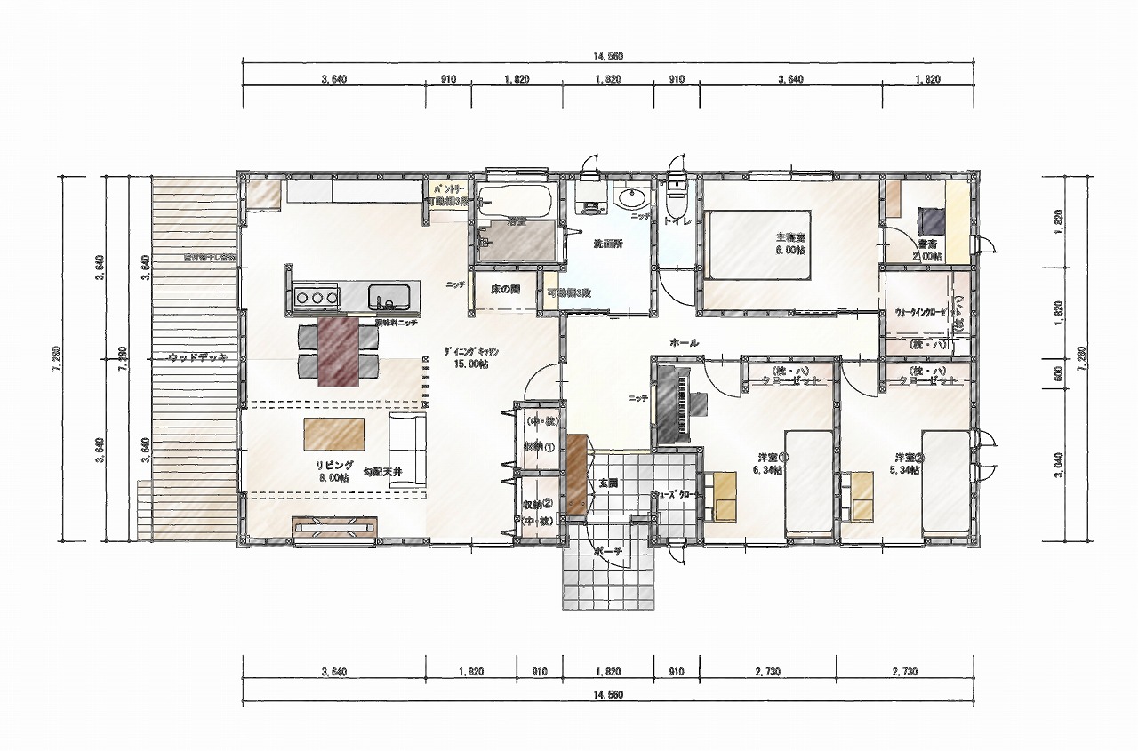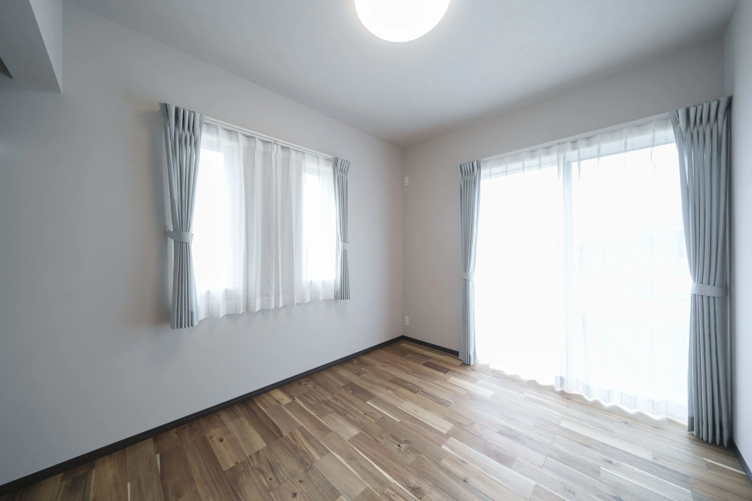 無垢床(アカシア材)と天井には木目調クロスを仕様し、全体的に落ち着いた空間へ仕上げに。WIC、書斎付き。