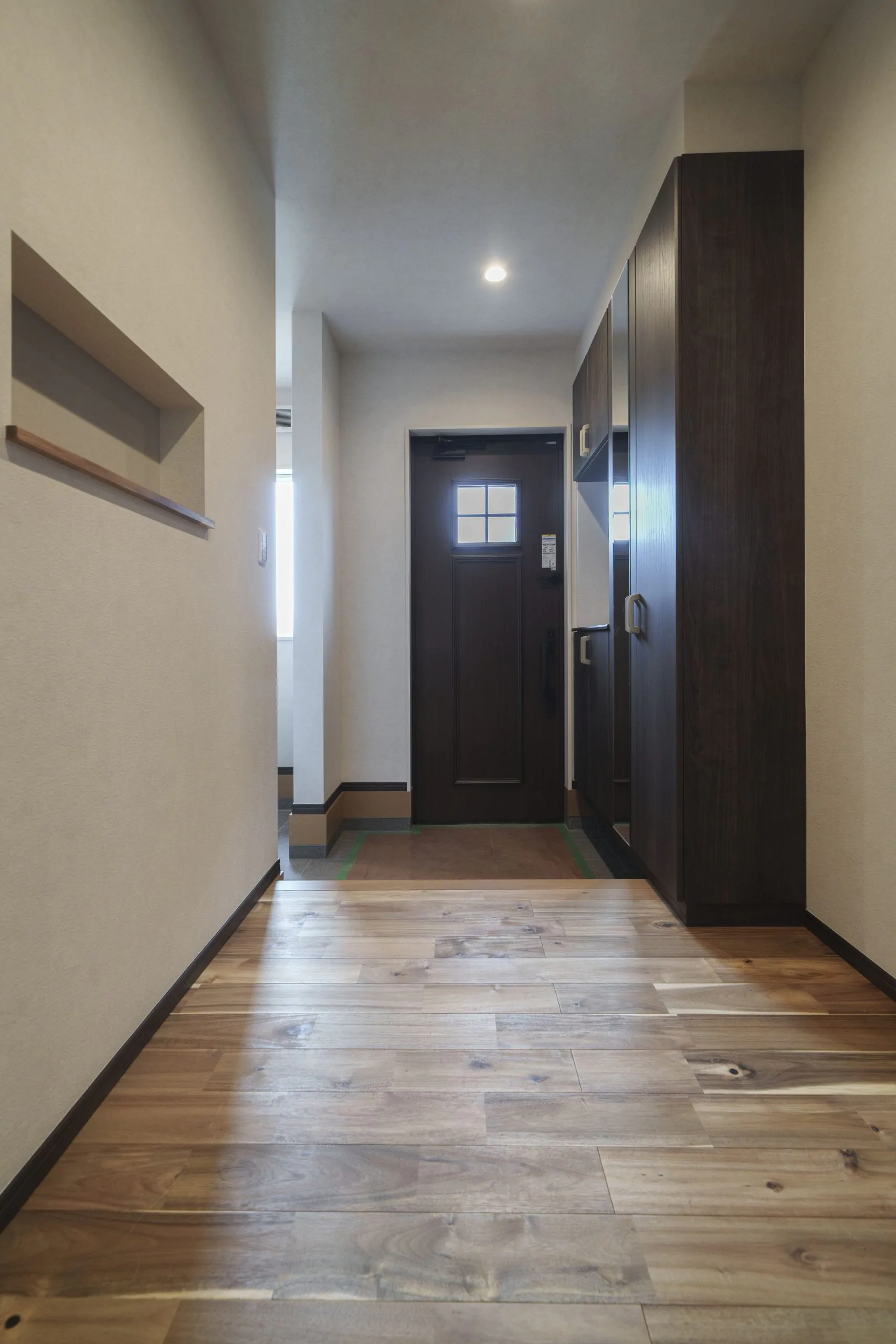関収納とは別に、土足のまま出入りできる収納スペース。「シューズインクローゼット」。靴の他にも、ベビーカーやお子様の三輪車、ゴルフバッグなど、外で使うグッズを一緒に収納出来ます。