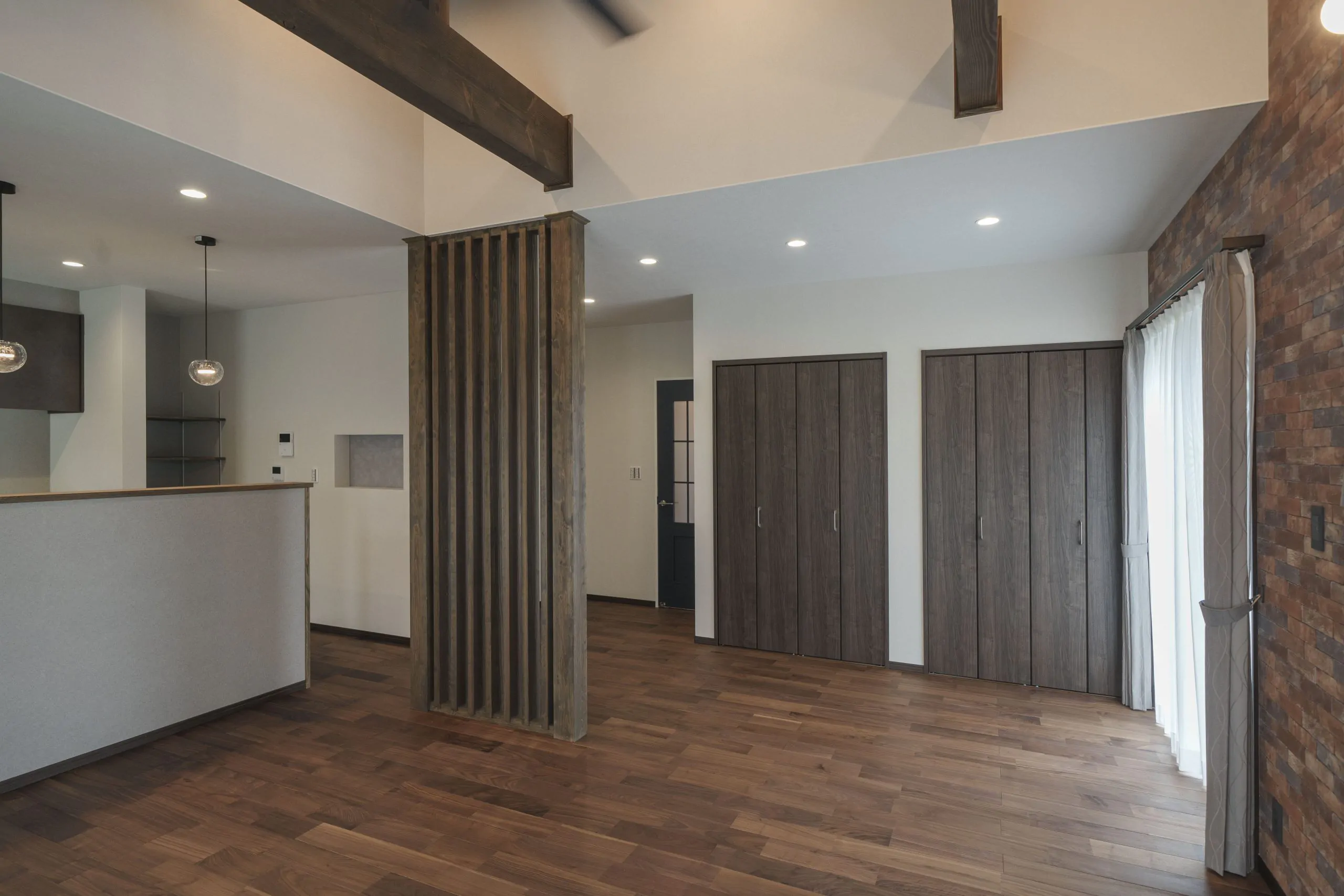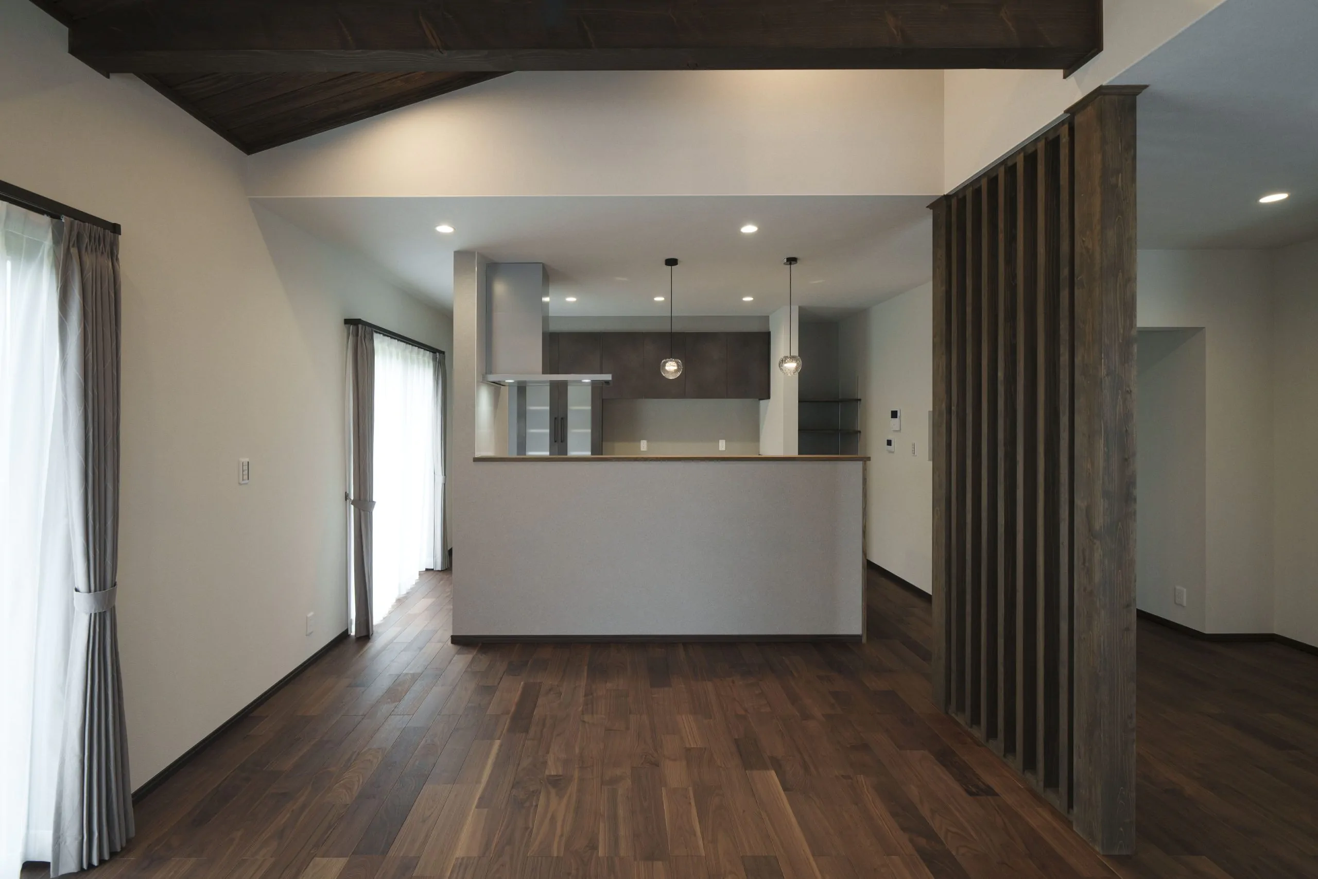 「木の存在感」と「開放感」を演出する勾配天井と見せ梁が特徴的な約24帖のLDK。温もりとデザイン性を高めるヒノキの格子も素敵です。