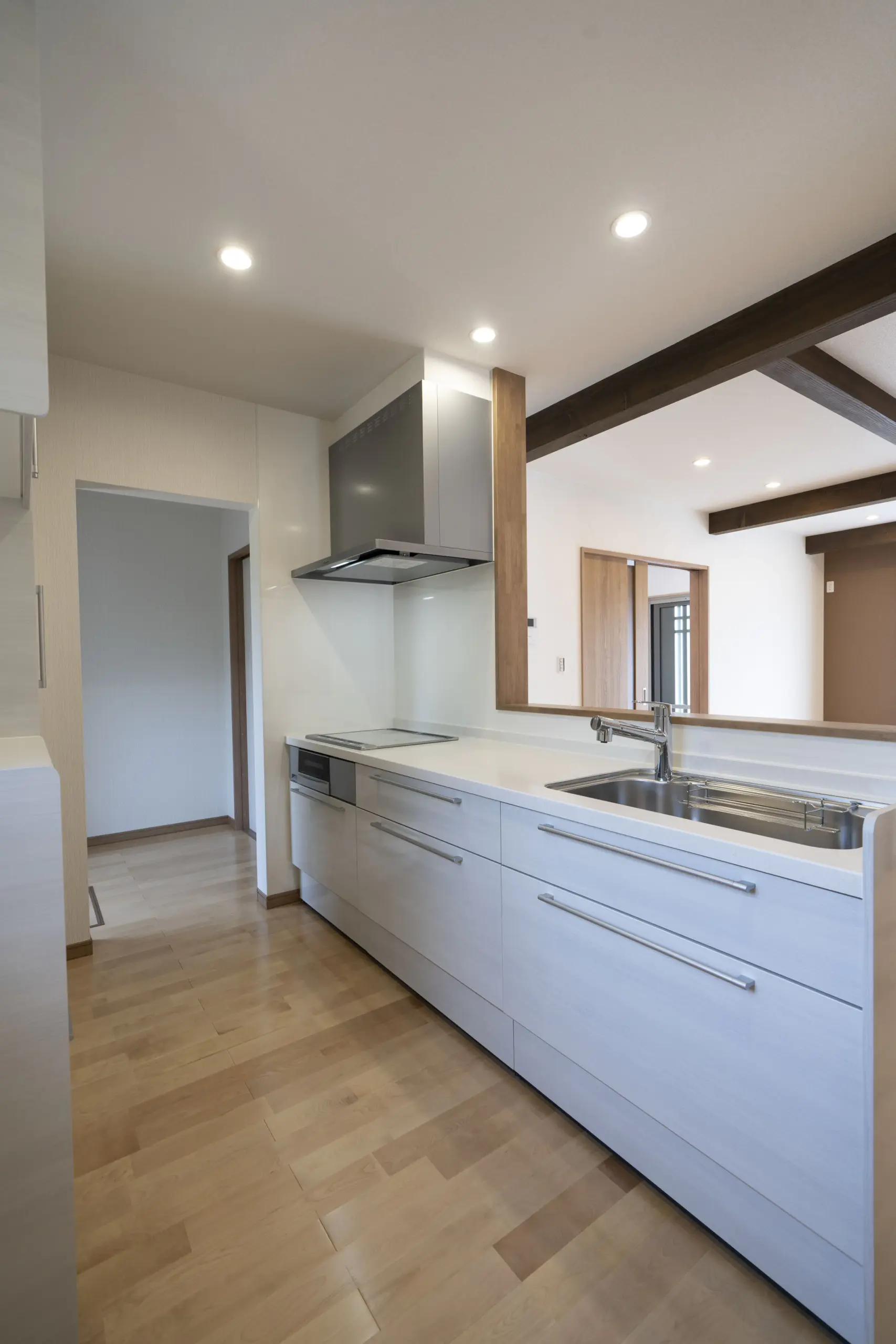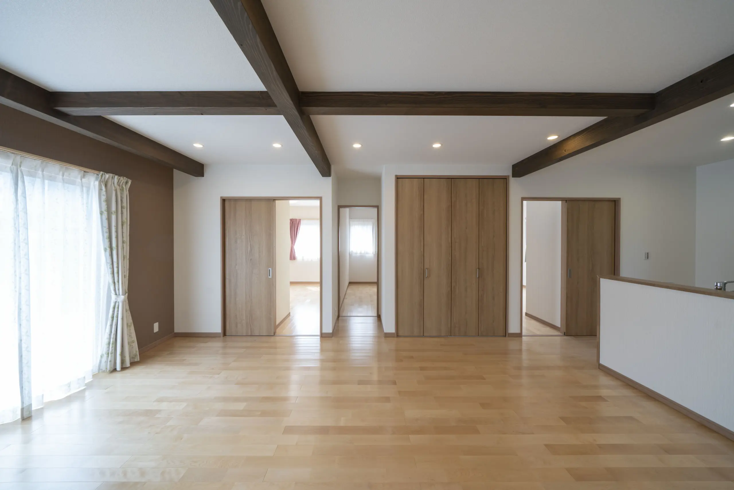 日常的に家族が集まる場所であり、客間として来客をもてなす場所でもあるリビングルームは、飽きのこないインテリアで。見せ梁は自然素材の為、調湿効果が期待できます。