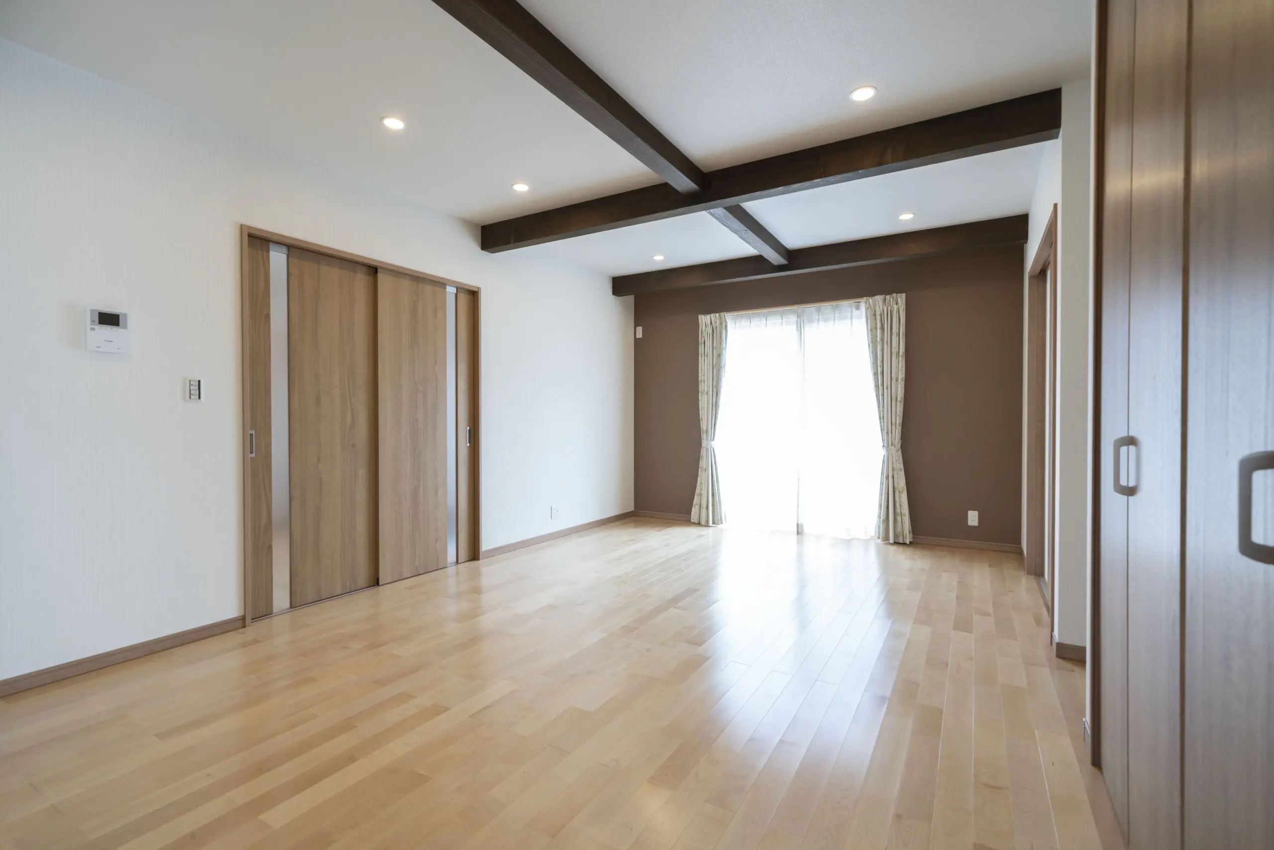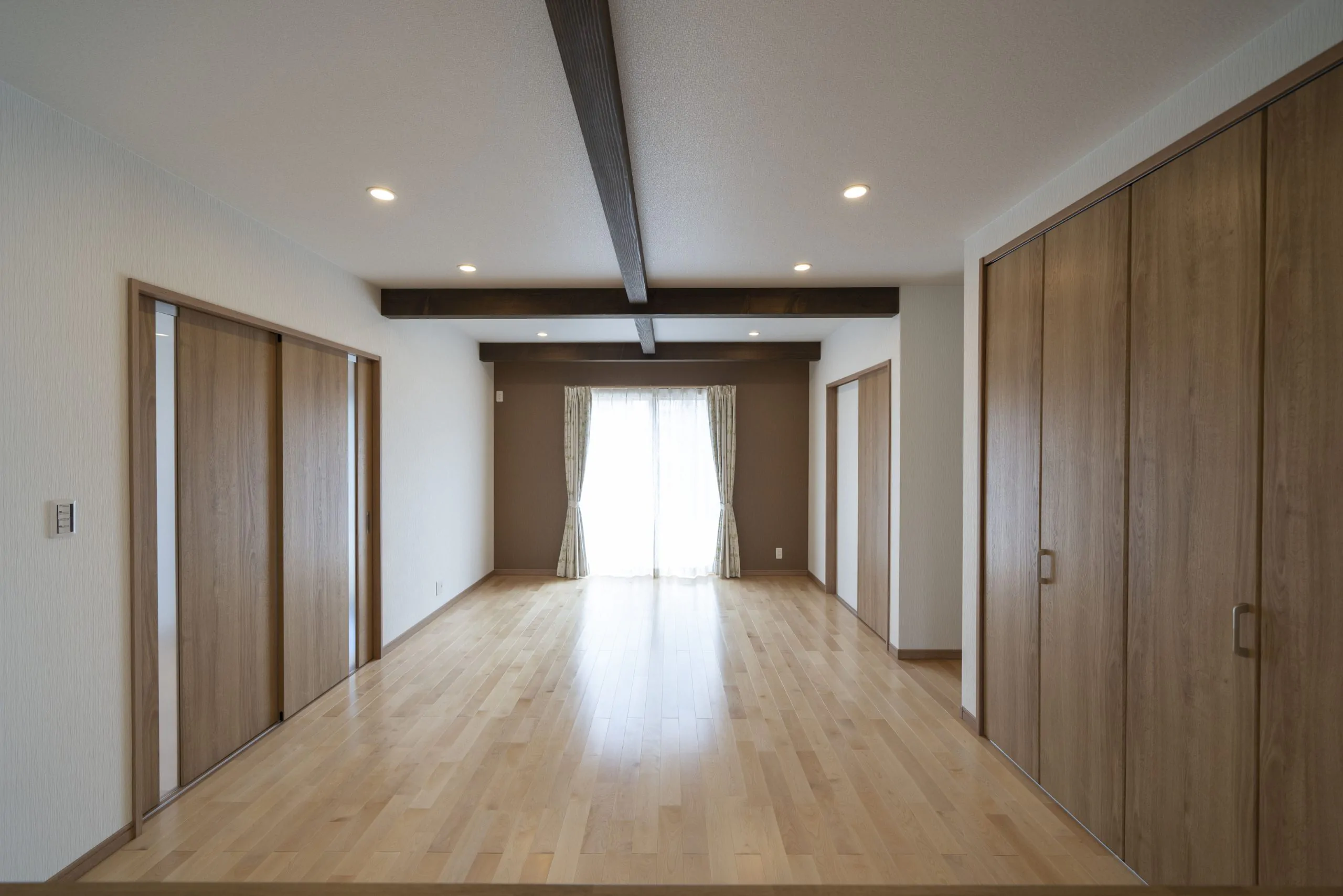 木の温もりとウォールナット色の見せ梁とアクセントクロスで落ち着きのあるモダンな空間に仕上げました。