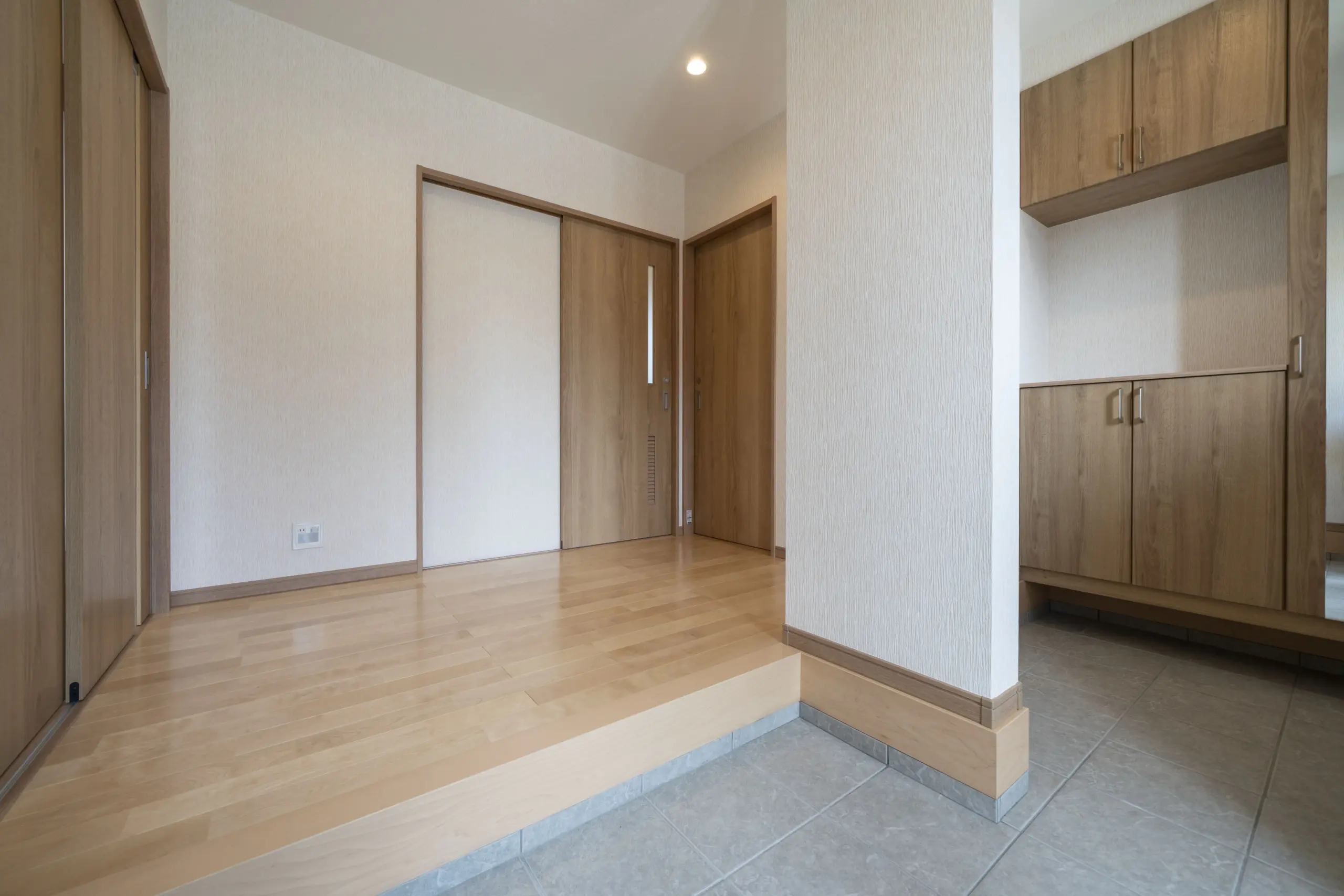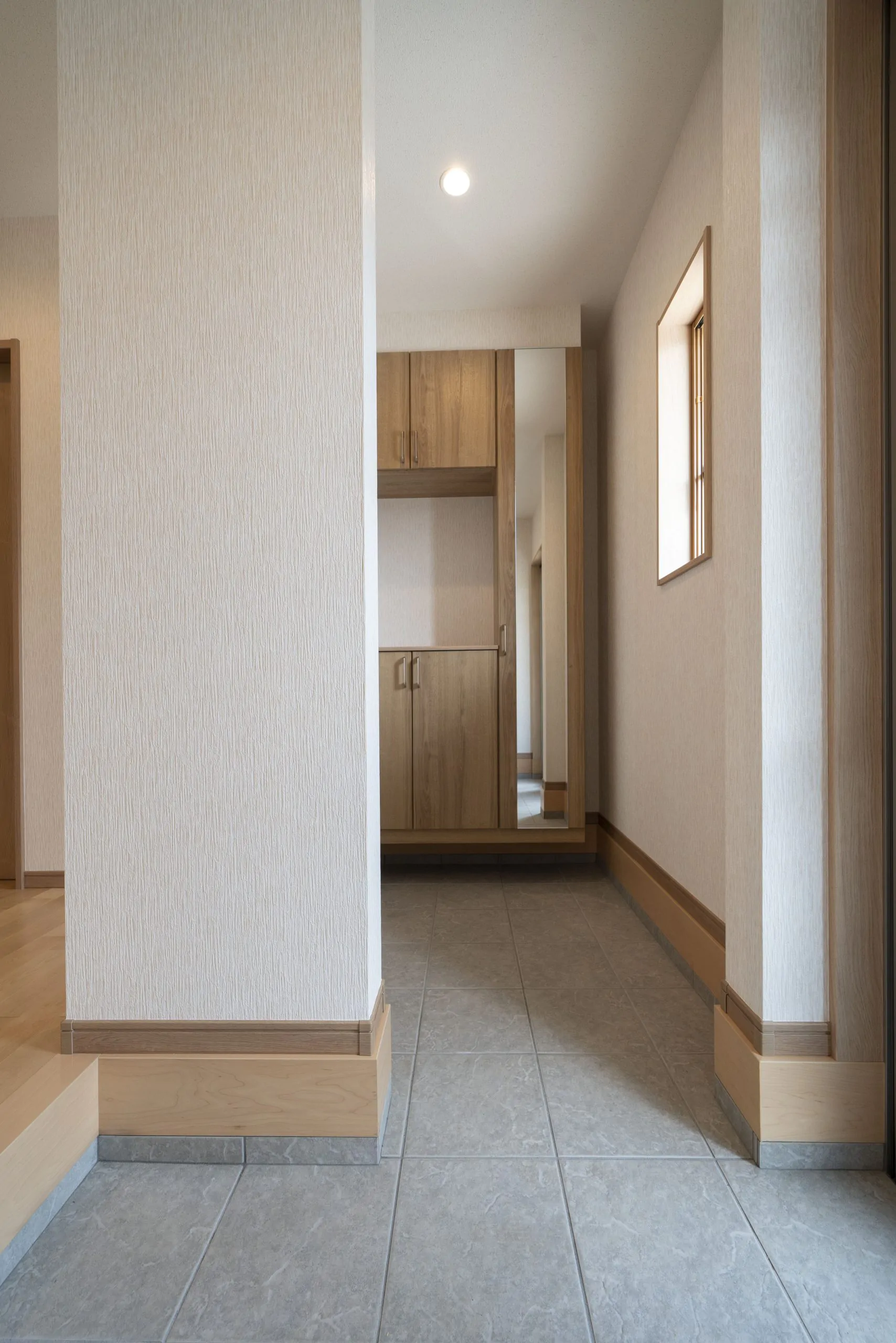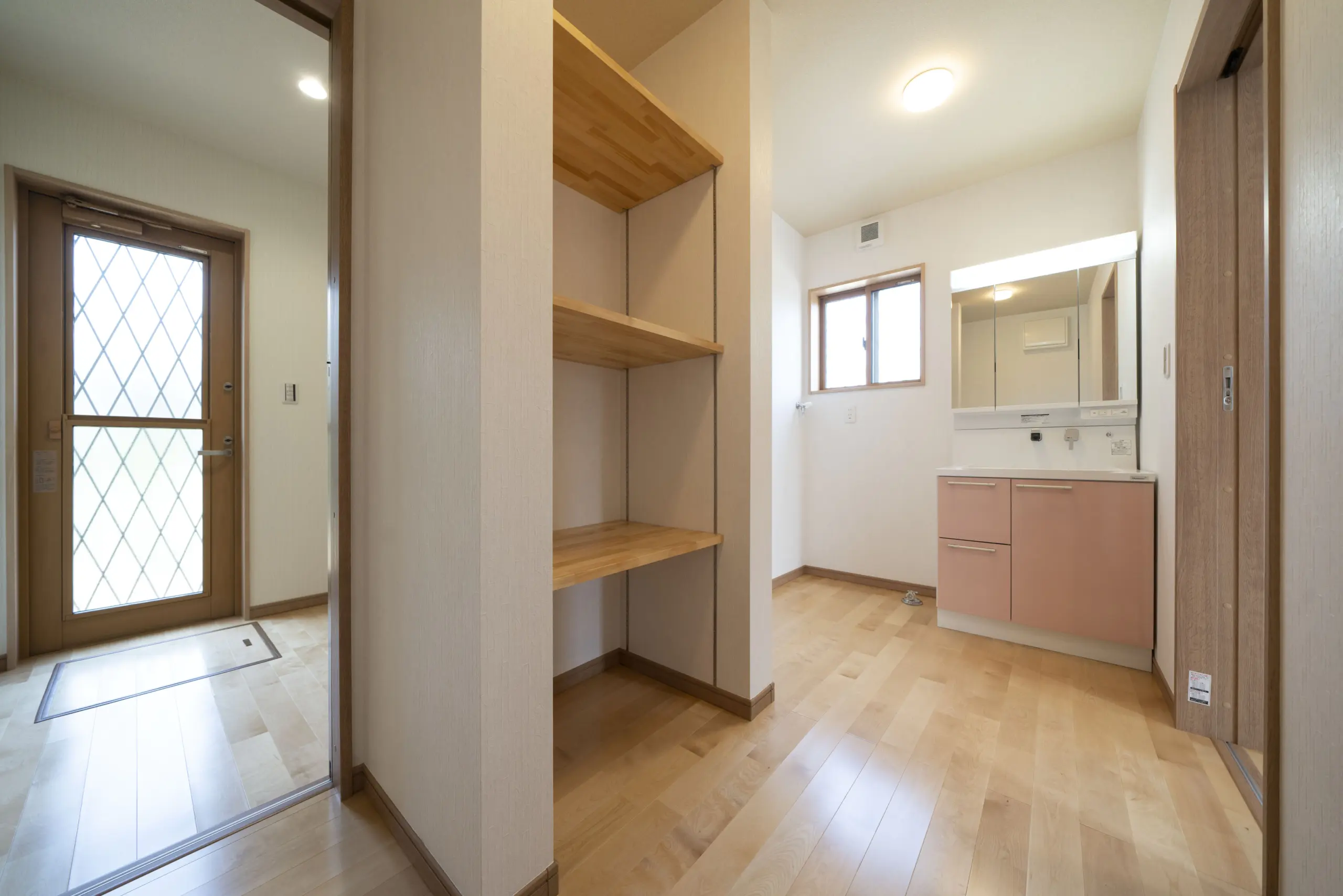 広々とした2way玄関は生活をより豊かな空間へしてくれます。来客時にも慌てることなく、余裕をもってお出迎えをすることが可能に。仕切りがあることで、物を整理しやすく、いつでも玄関をきれいに保てます。