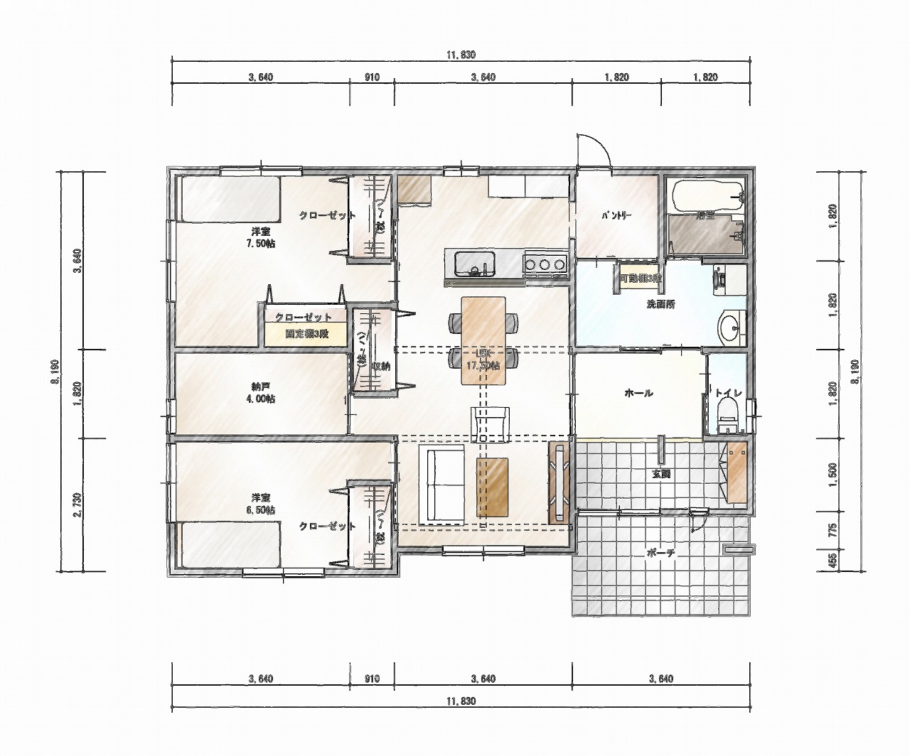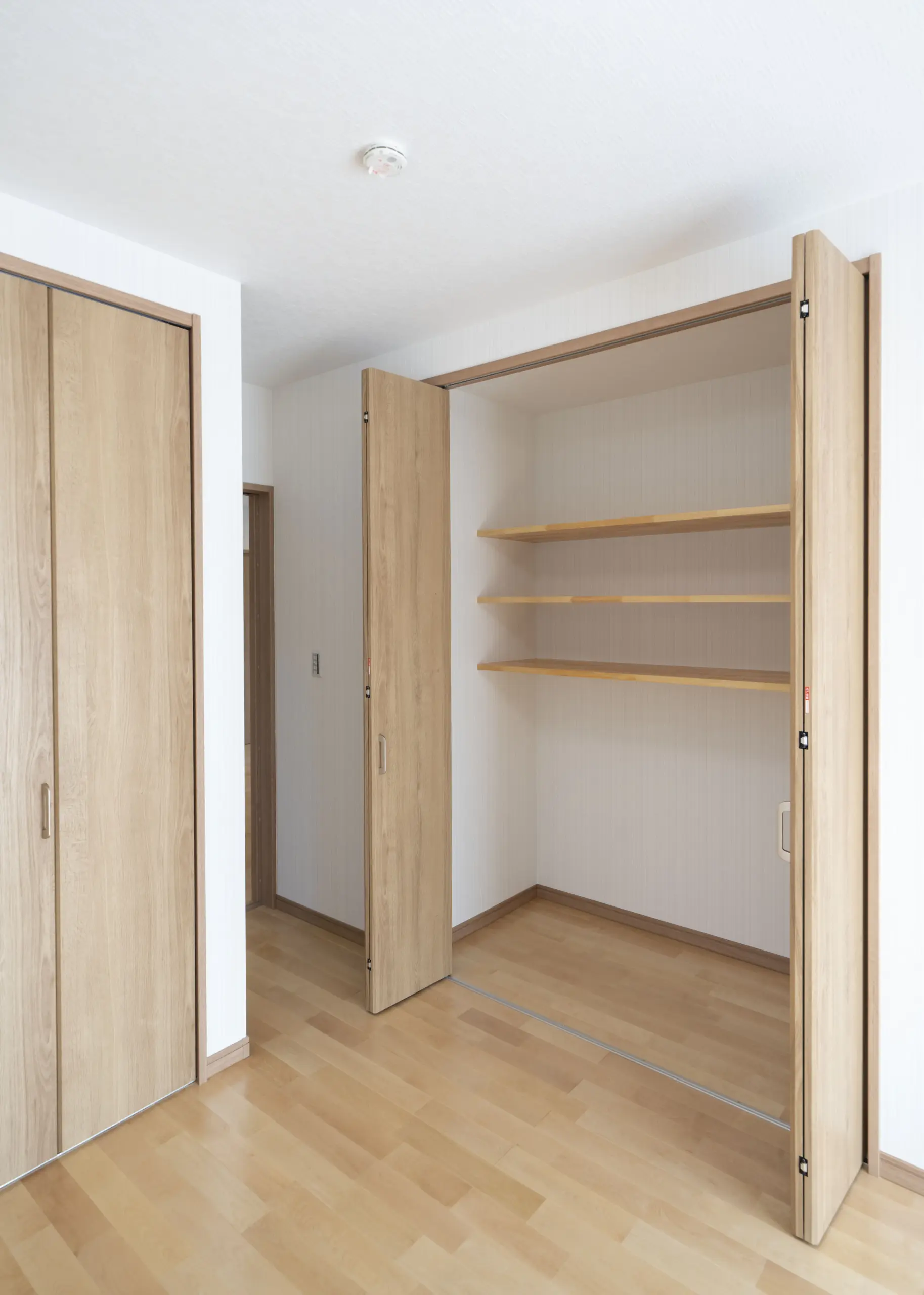 ホールを最小限に減らした間取りは、リビングから直接各部屋に繋がる動線で利便性・快適性を格段に向上させました。リビングには大型の収納スペースを設け、リビングをスッキリ見せる事が出来ます