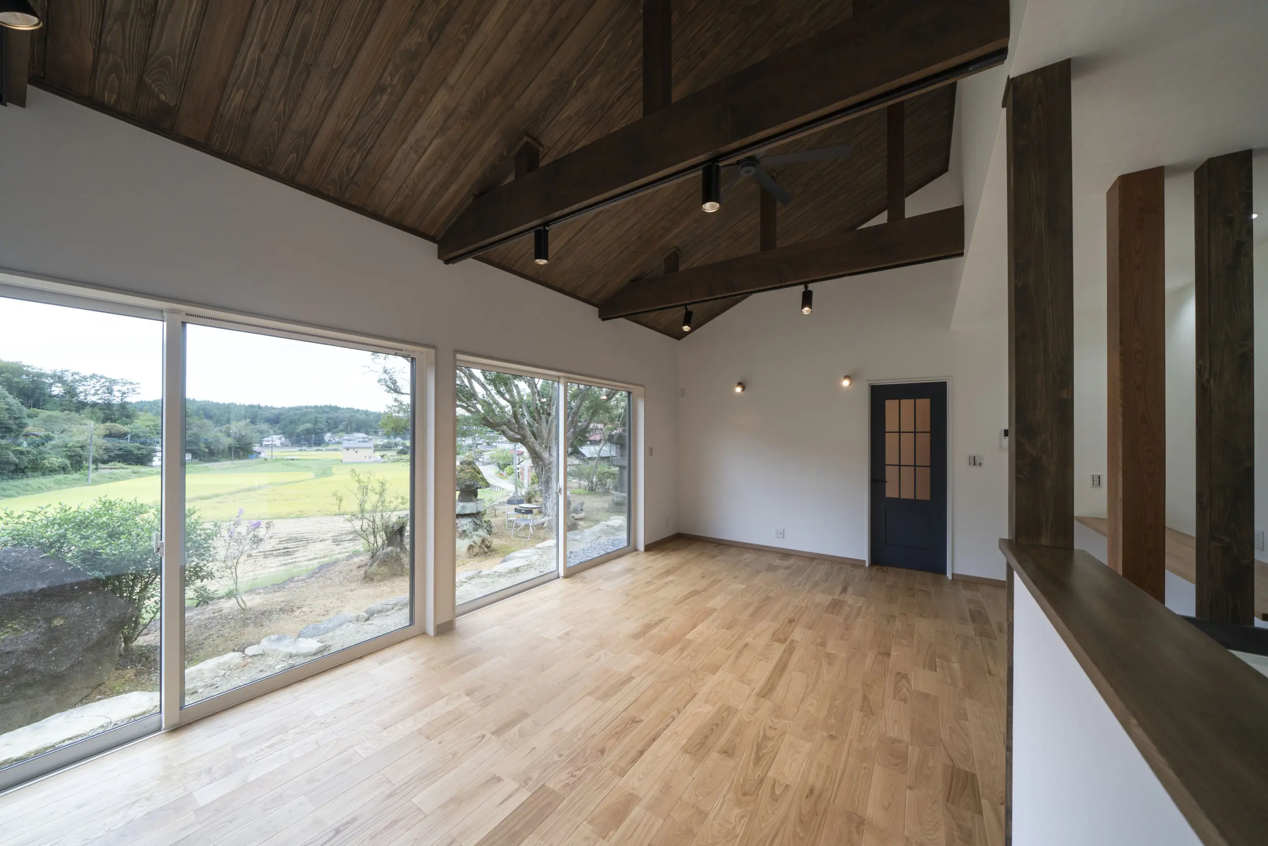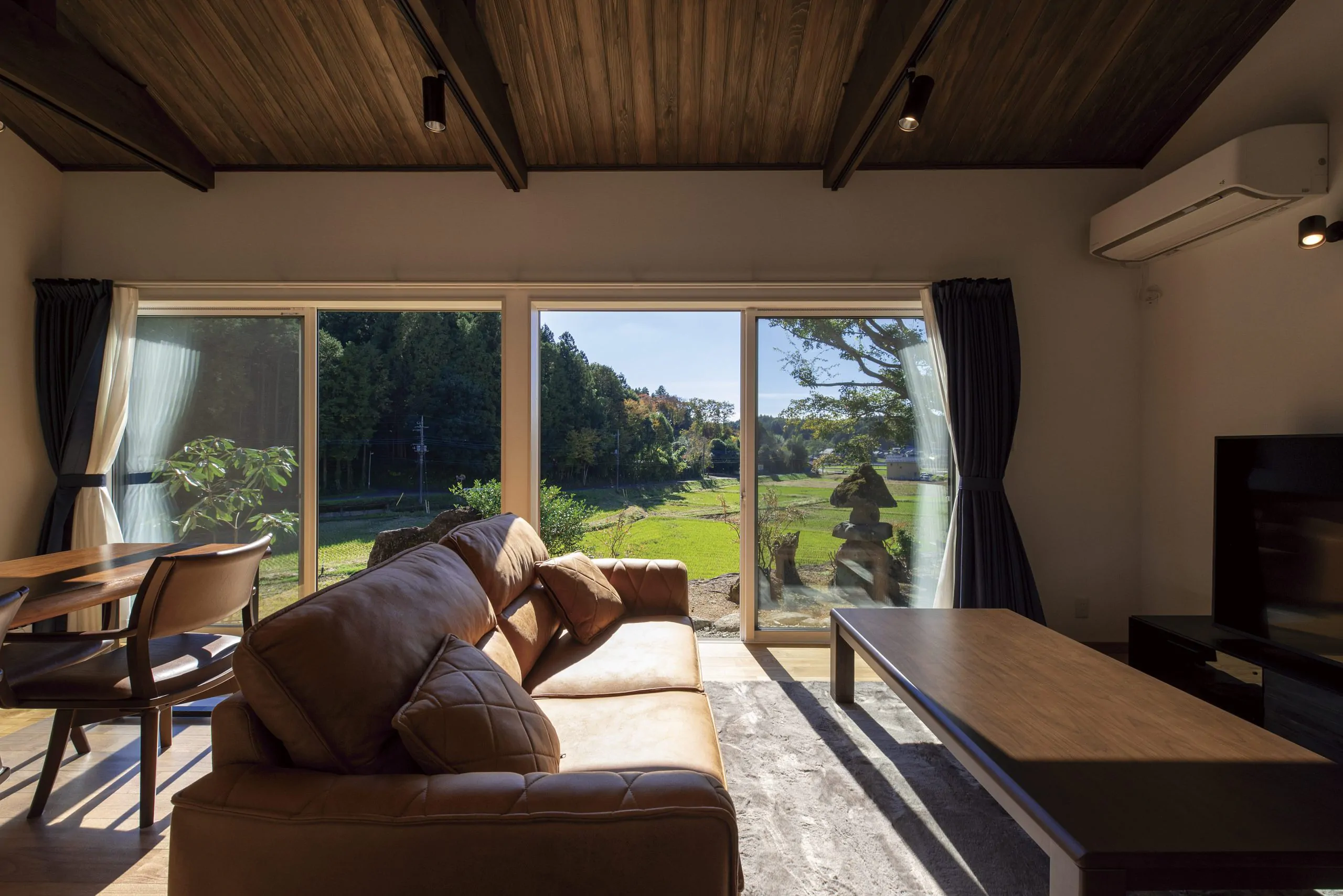 目の前に広がる広大な景色を堪能するために配置した大開口サッシはたっぷりと光が注ぎます。窓を開けるとささやかな風が抜け、そこから見る景色が安らかな気持ちにしてくれます。