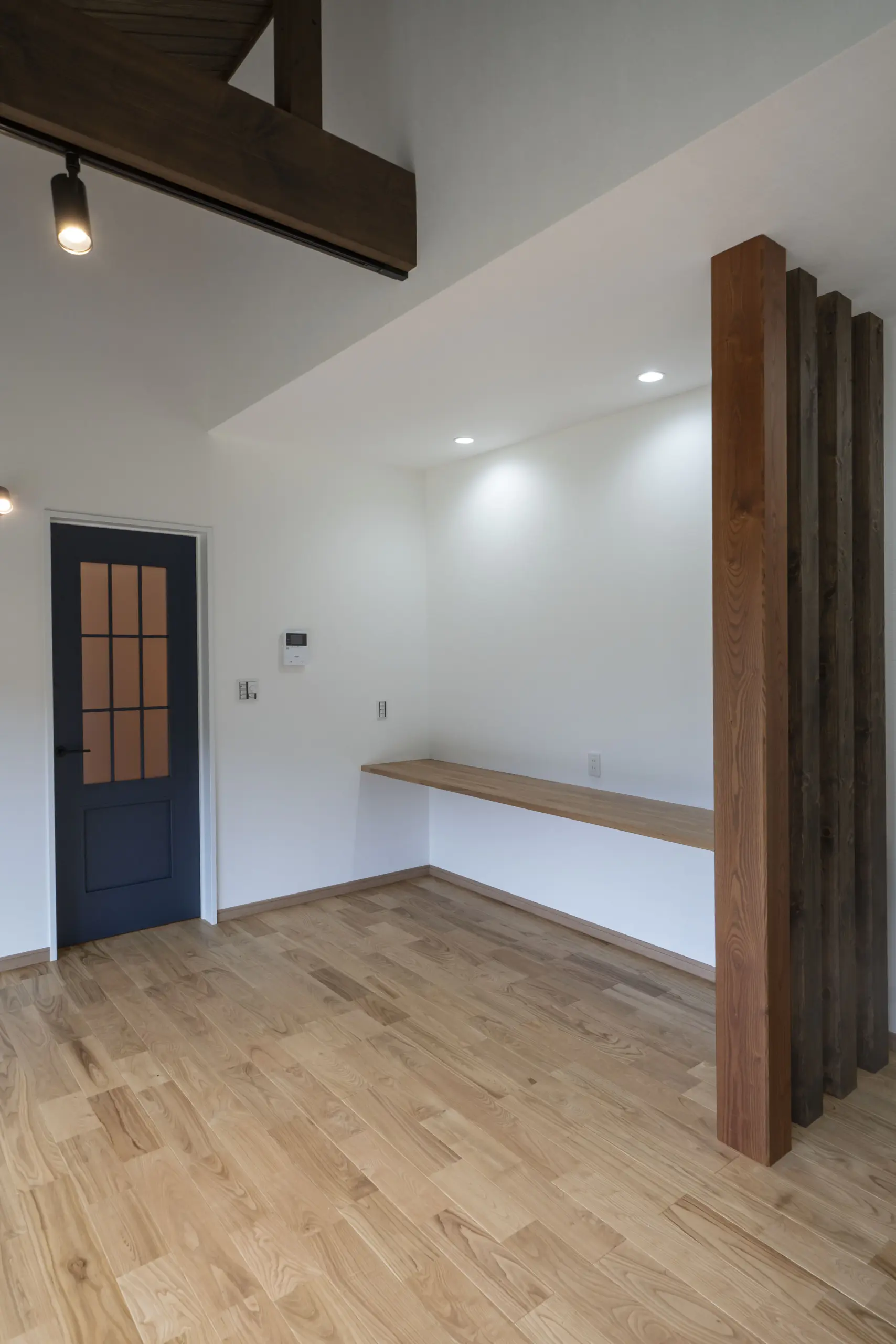 家具を置いてもゆとりのある広々としたLDK。暮らしやすいコンパクトな平屋ながらも勾配天井で開放感をさらに創出。カウンターテーブルもあるのでお子さんの勉強やパソコンを置いてお仕事もできますね。