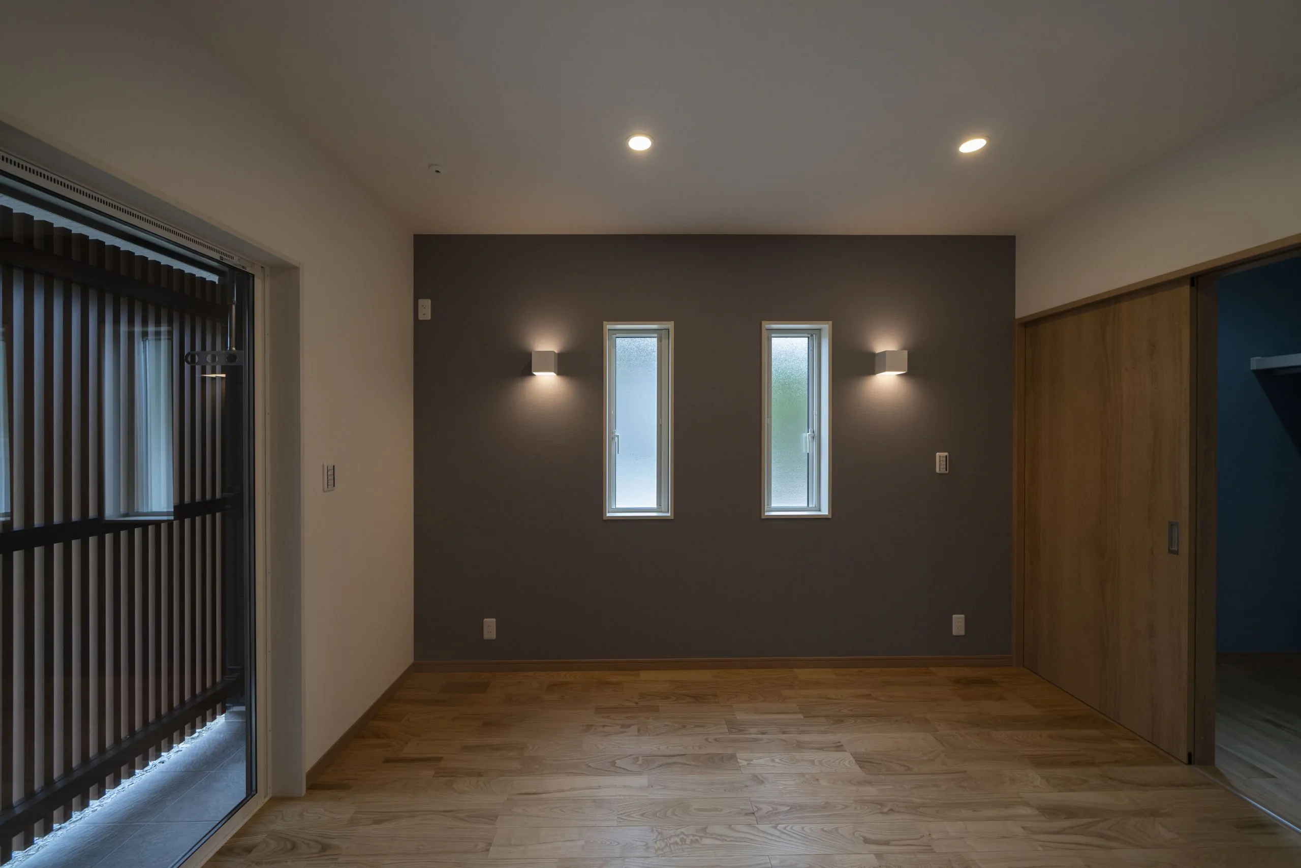 寝室はくつろぎの場所なので、明るすぎず、程よい光が入るように設計。ブラケットライトを取り入れることで、影ができ雰囲気のある空間が生まれます。さみしくなりがちな壁のインテリアになりますね。