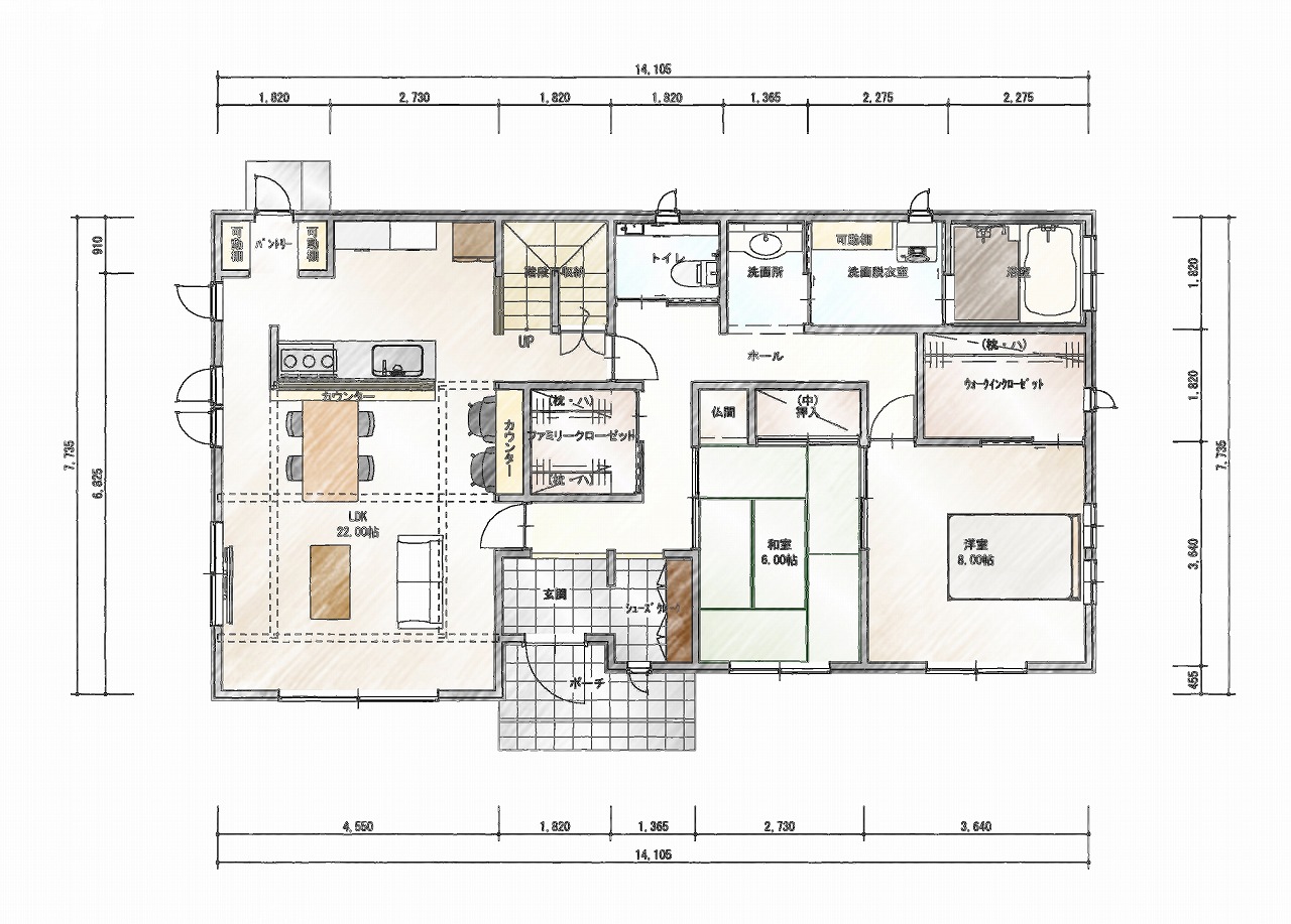 キッチンの周りは回遊できるようになっており、キッチン奥のパントリーにもスムーズに行く事が出来ます。