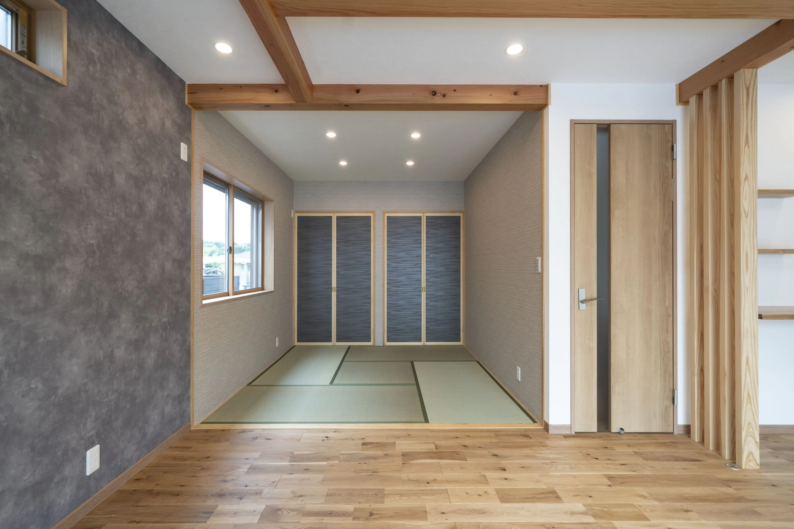LDKに隣接する4畳半の和室。扉を無くすことで圧迫感を感じさせない空間デザインになっています。