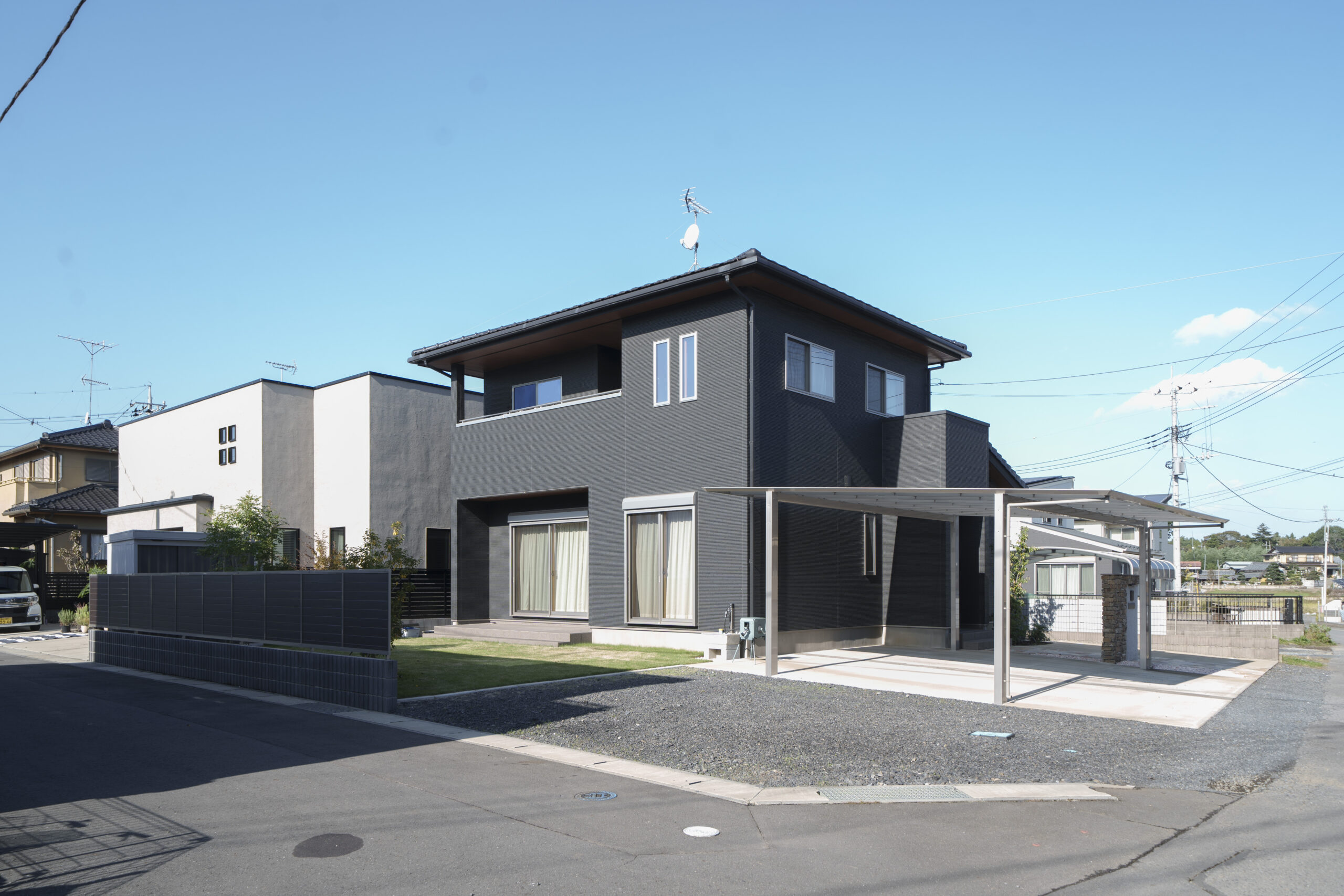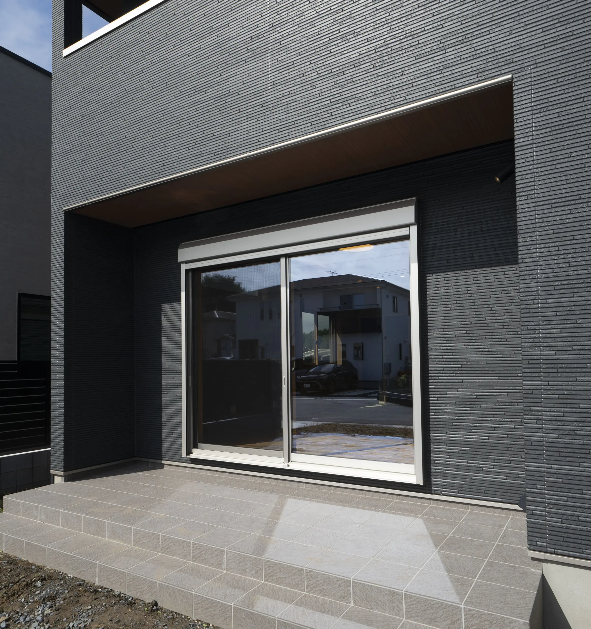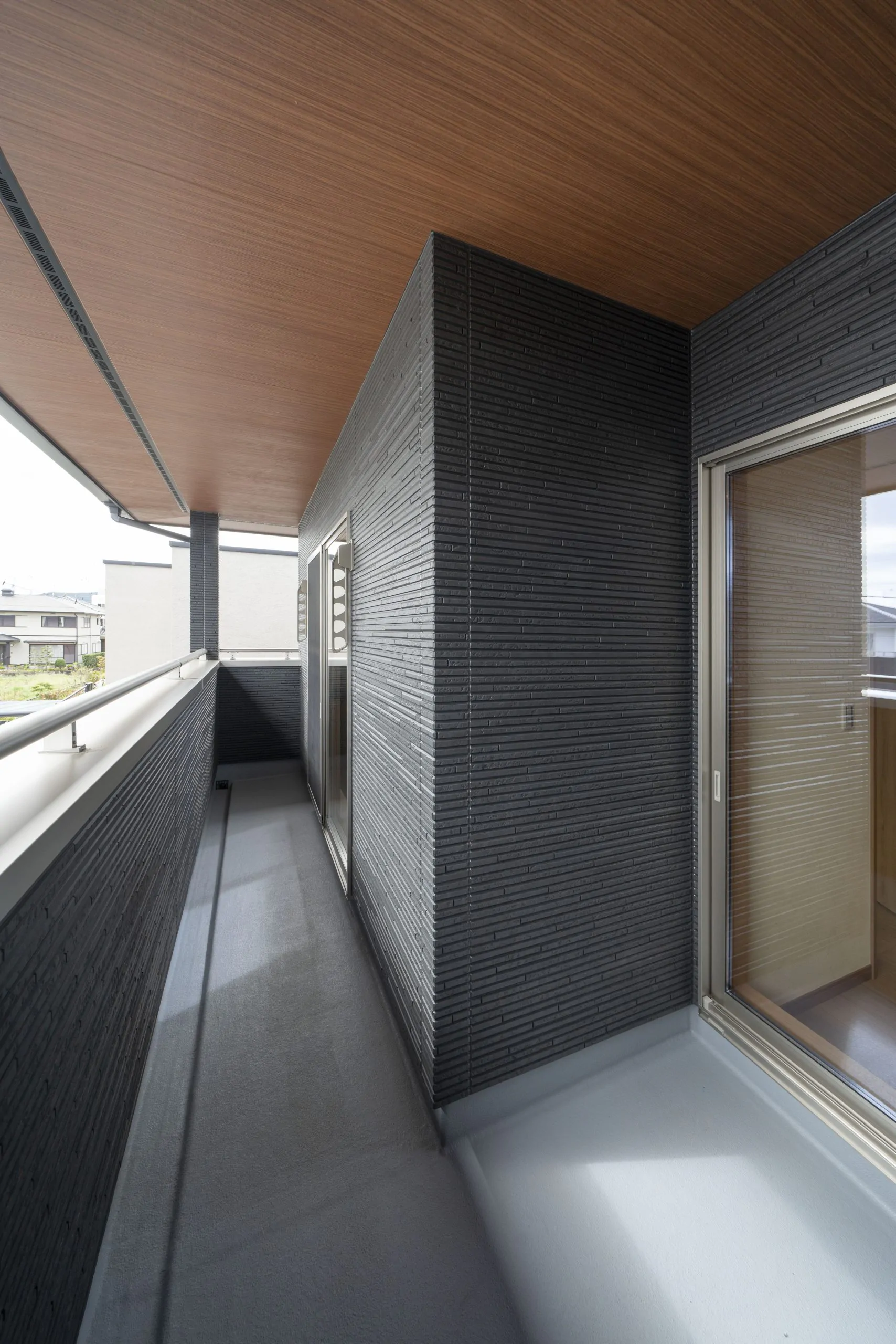 木目調の軒天を取り入れ黒の外壁とのアクセントに。広いバルコニーは洗濯を干すのにもストレスなく使用でき、インナーバルコニーのため急に雨が降ってきても濡れる心配がなく急がなくても済みますね。