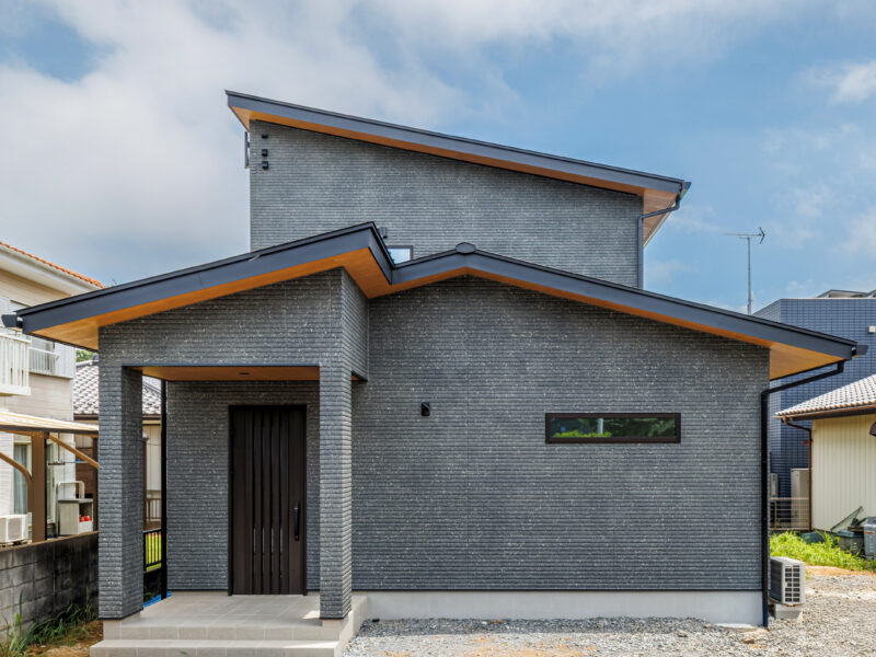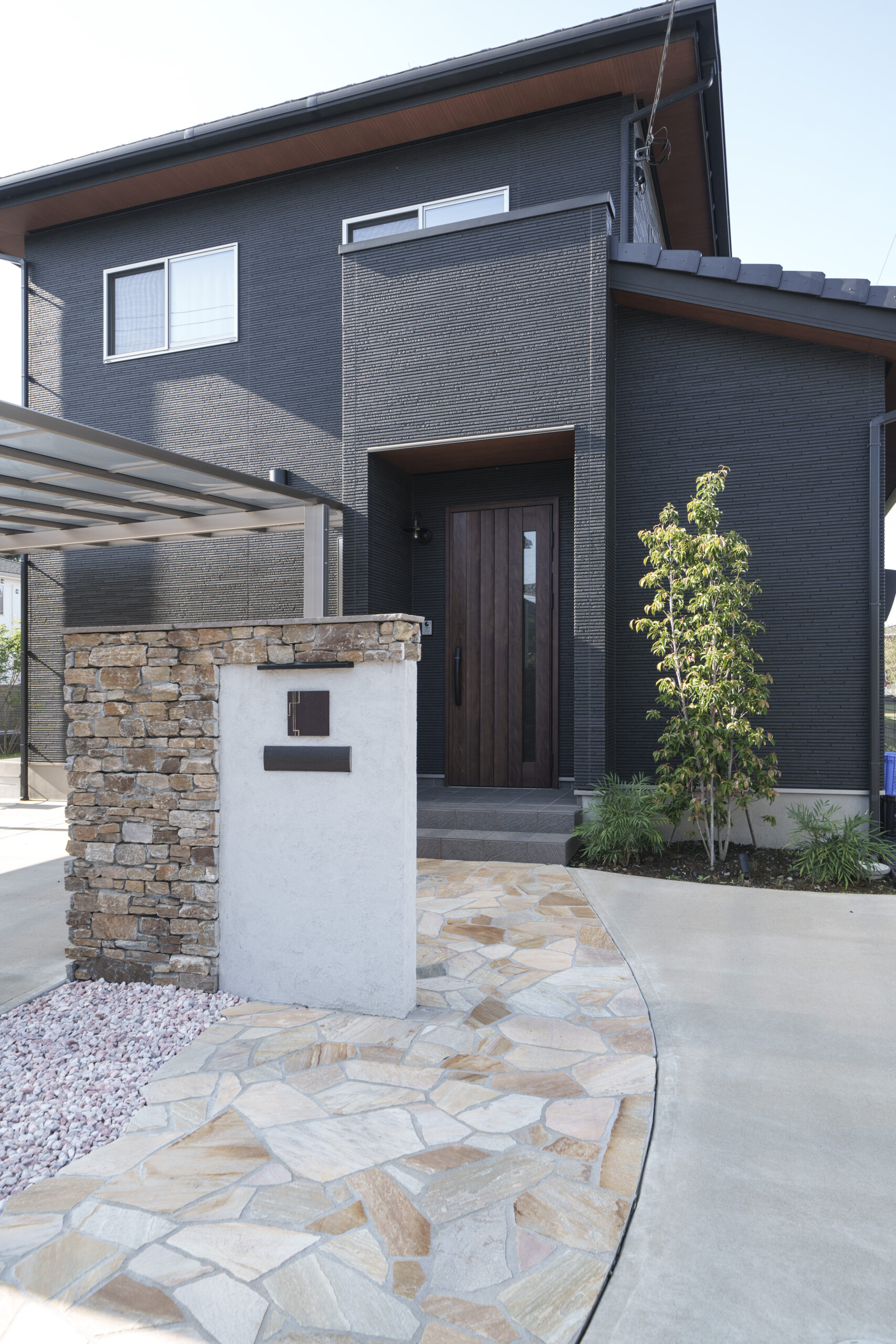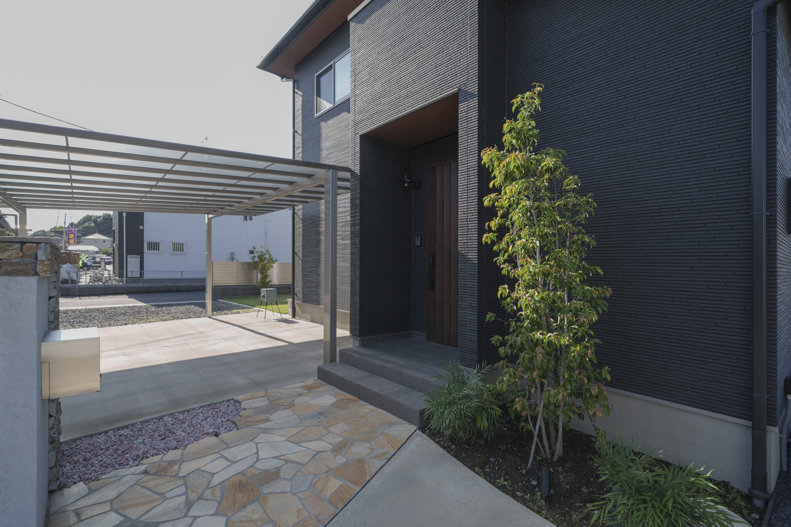 木目調の軒天を取り入れ黒の外壁とのアクセントに。広いバルコニーは洗濯を干すのにもストレスなく使用でき、インナーバルコニーのため急に雨が降ってきても濡れる心配がなく急がなくても済みますね。