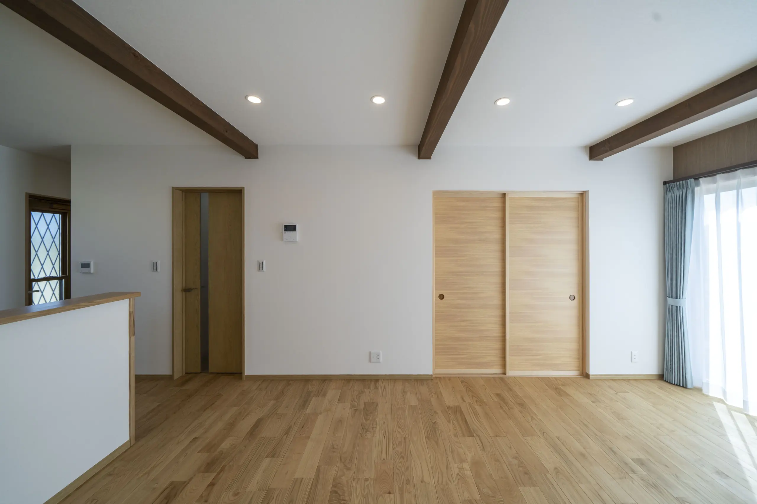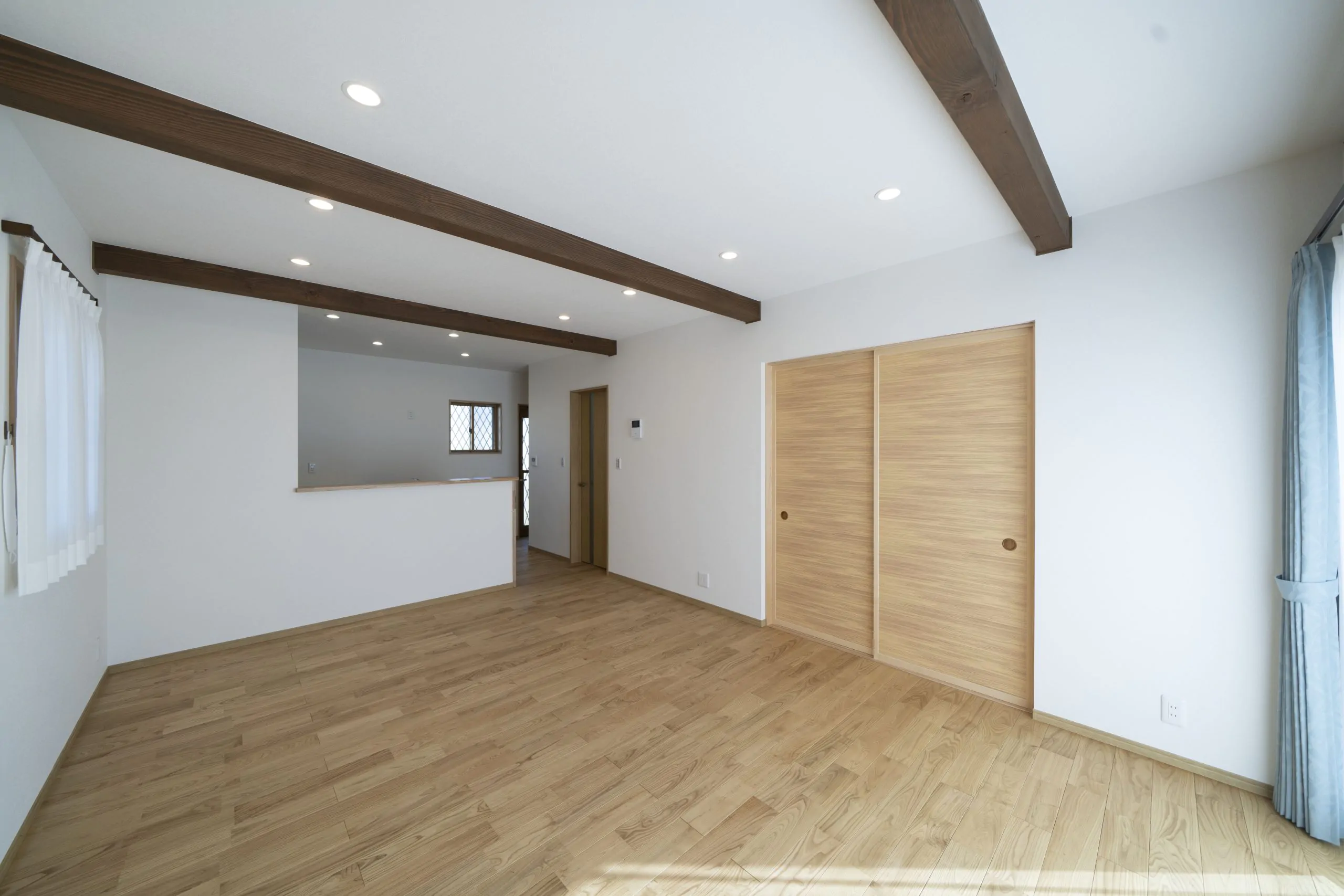 16帖のLDK。床材には無垢のクリ材を使用。見せ梁をあしらい木の存在感を見せた空間となっております。身体に良い自然素材だから安心して暮らせます。キッチンにいてもリビングを見渡せ、会話も楽しめます。