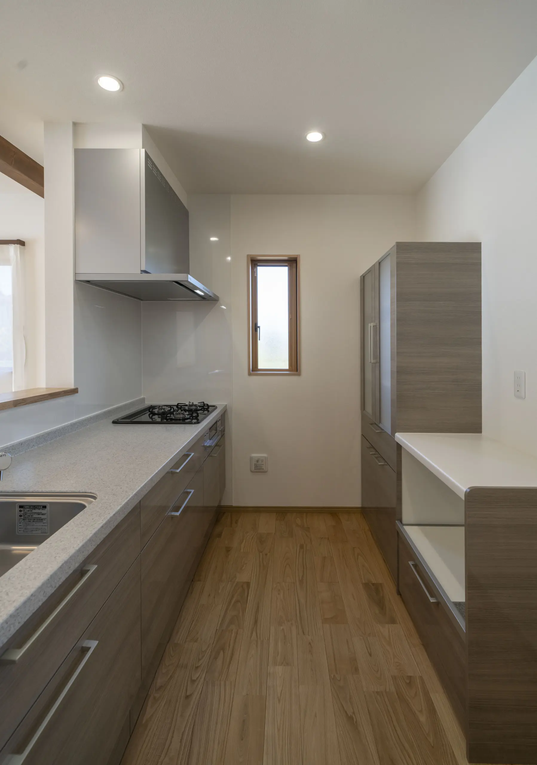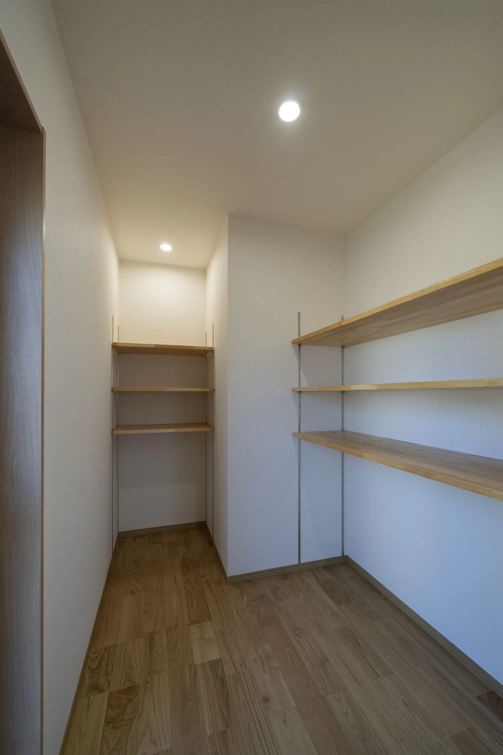キッチン横に設けた広めのパントリーに可動棚を設置。棚があると収納しやすくなり、大きさに応じて棚の高さを調整できます。扉をつけずリビングからスムーズに行けるようになっています。リビングからはパントリーの中が見えない為、空間がスッキリ感じられます。
