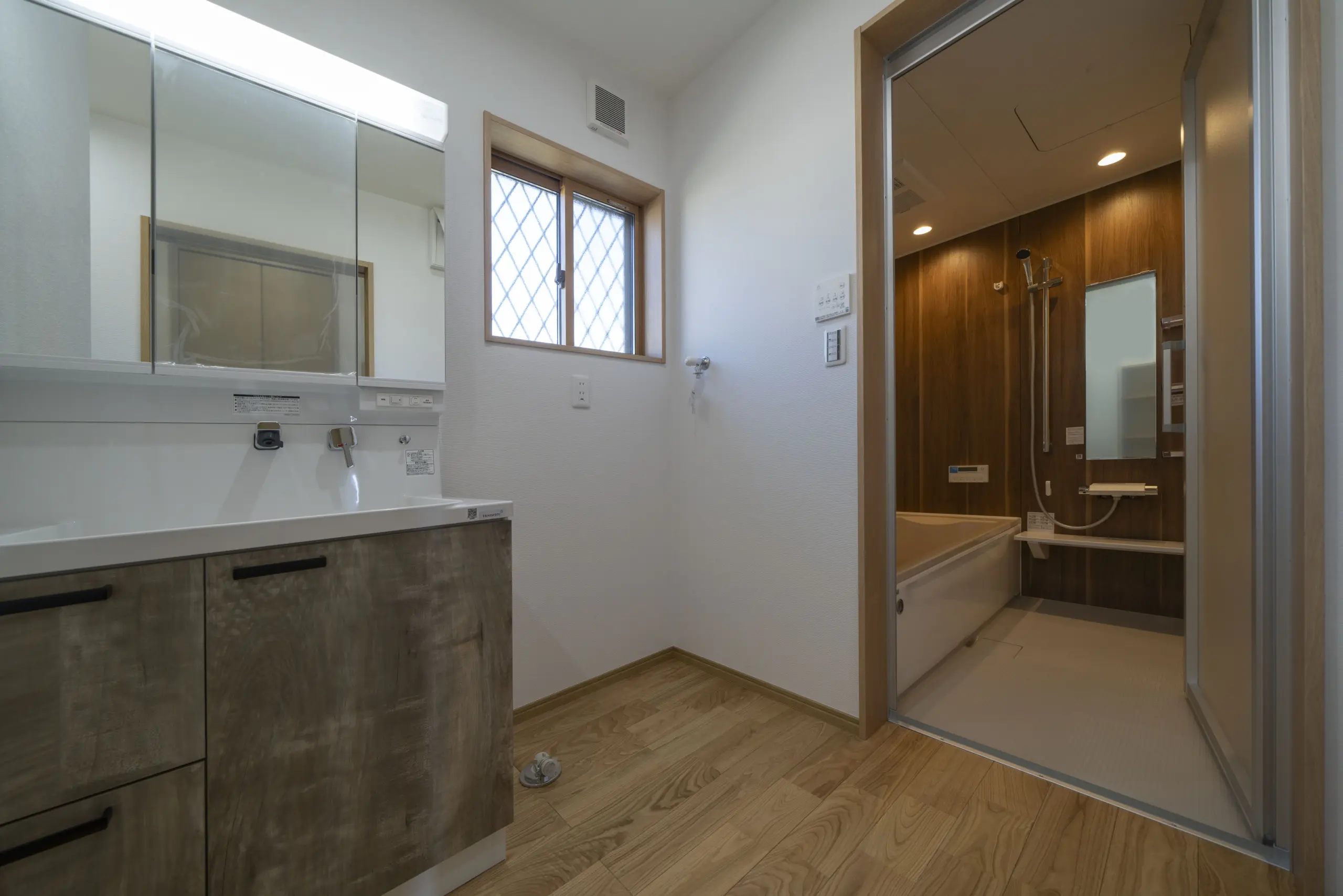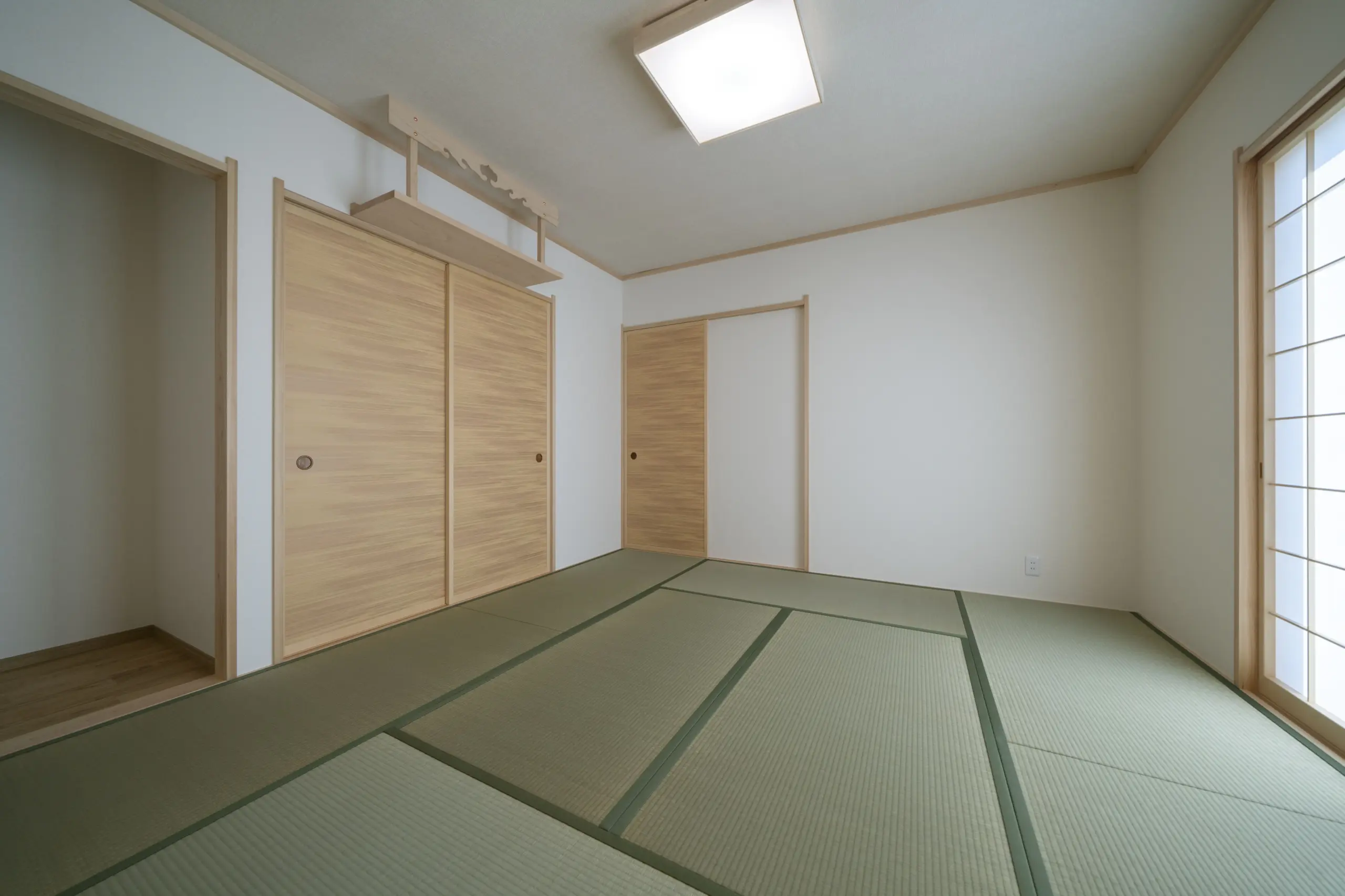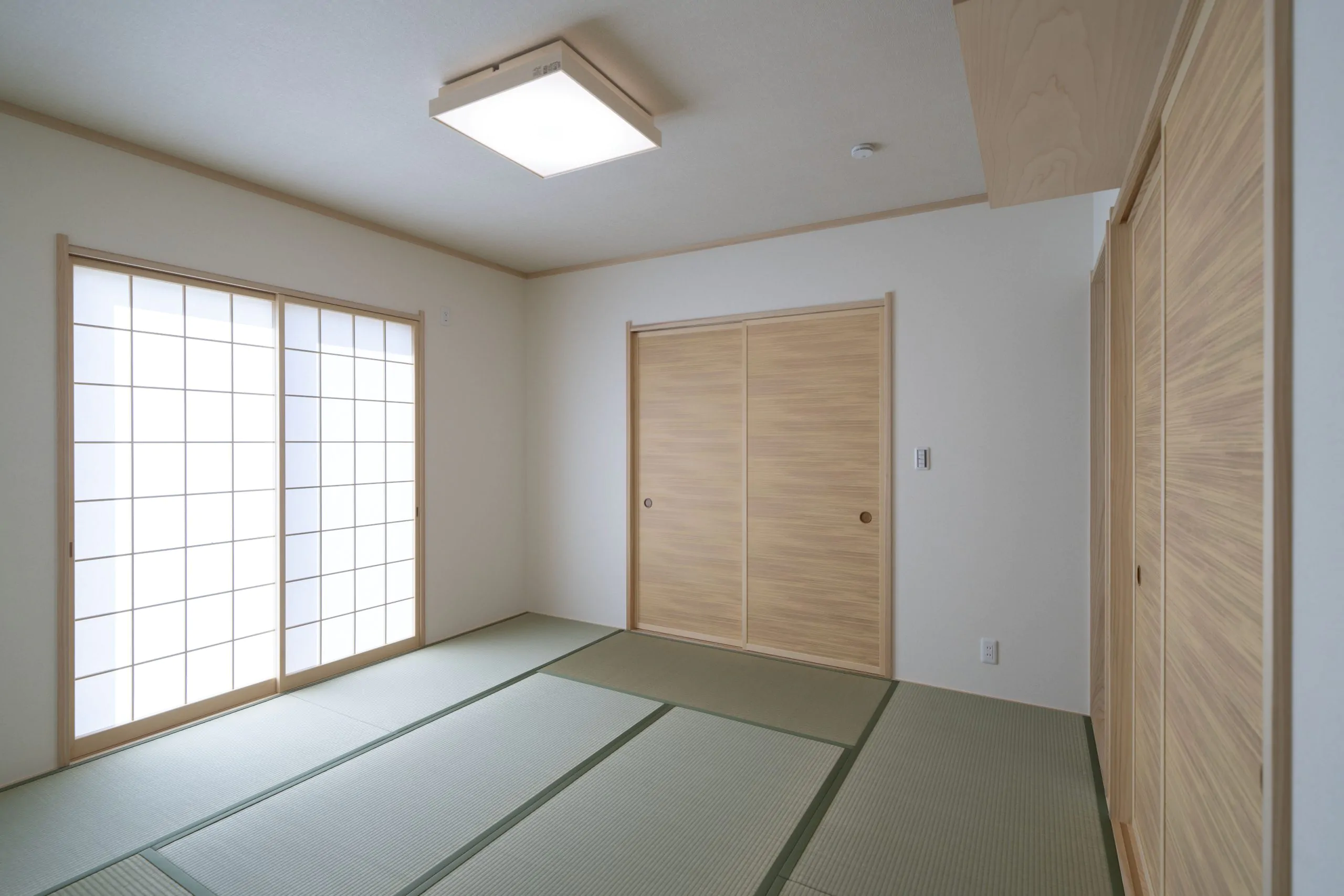 8畳の和室は、玄関→和室→リビングと通じている為、急なご来客でも玄関からすぐ和室へ通す事が出来ます。また襖を開けておくとリビングと合わせて開放的な空間になります。様々な用途で使える和室はイ草の畳やヒバの襖建具の自然素材によりリラックス効果もあります。