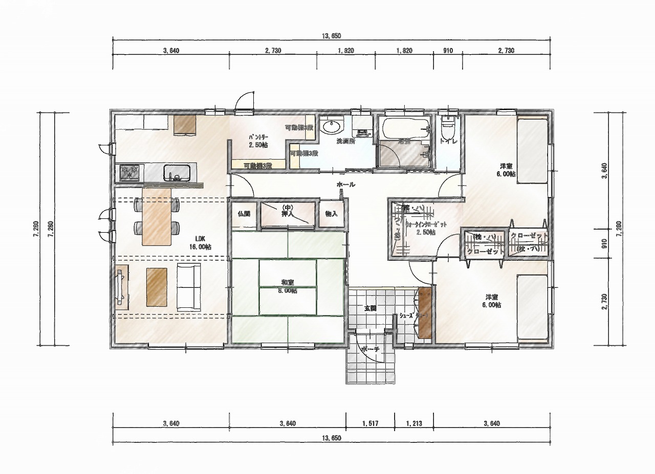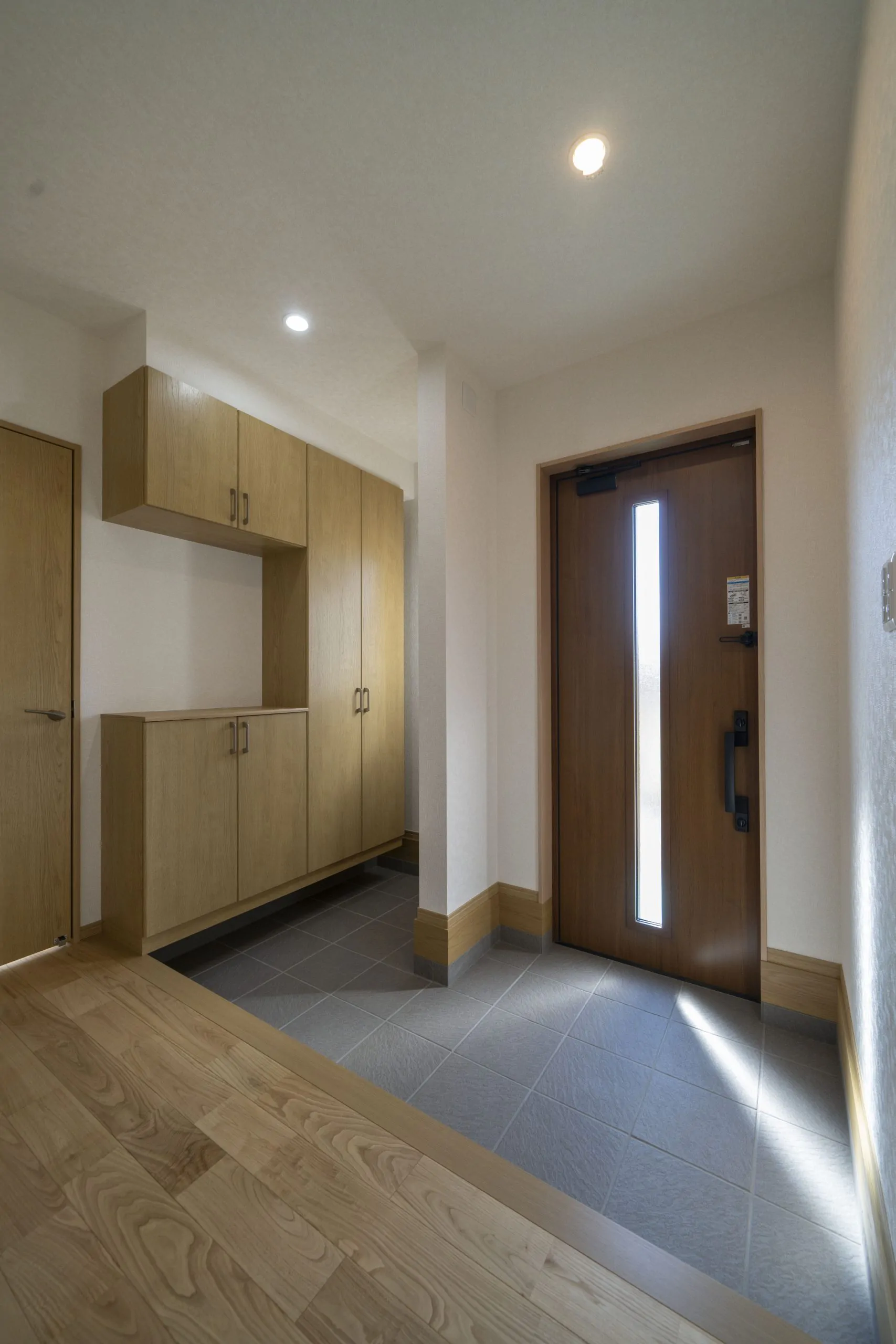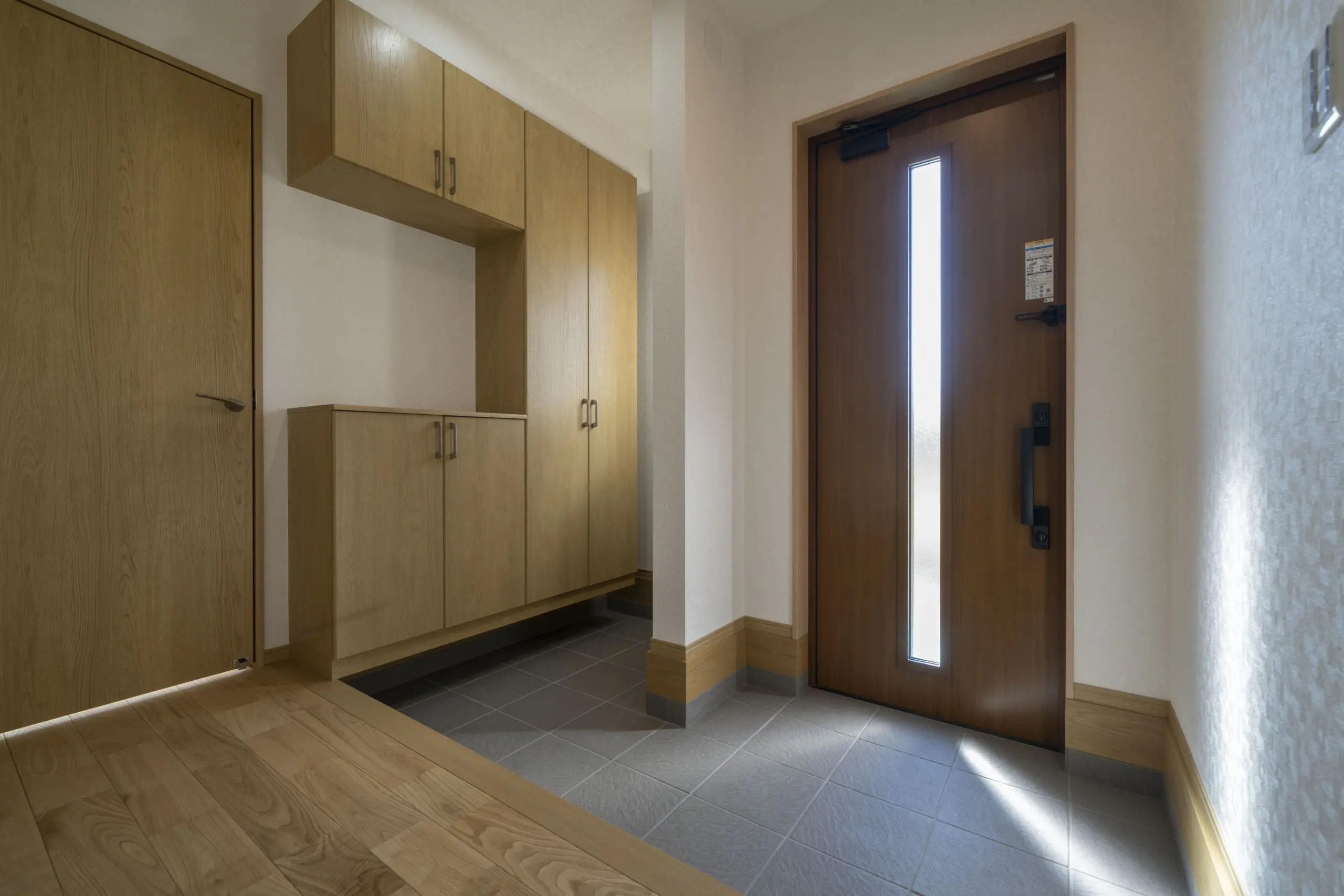 玄関横に物を置けるスペースを確保し、壁があることで靴だけでなく、傘やちょっとした小物が置きやすく利便性が高い空間に仕上げました。