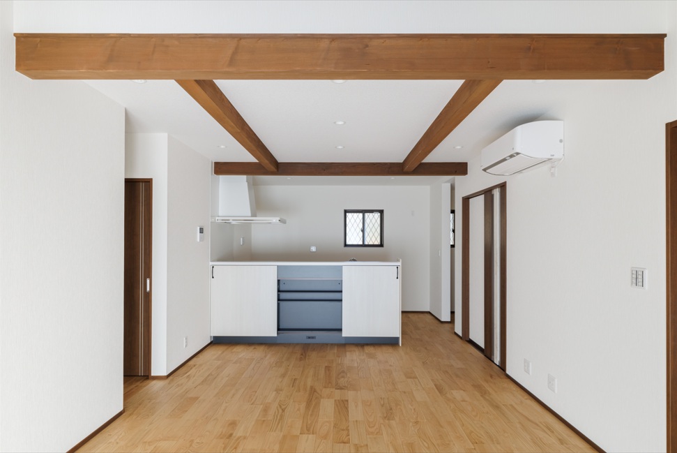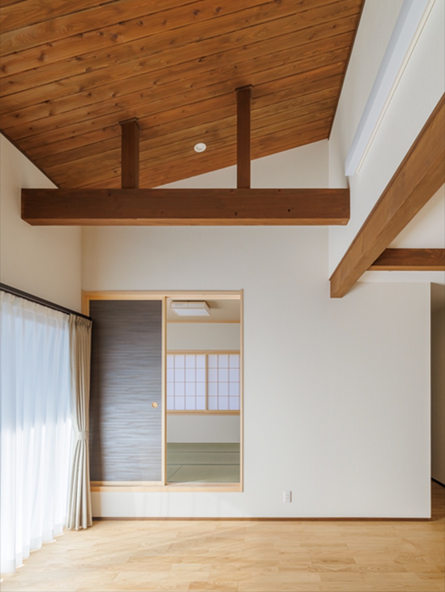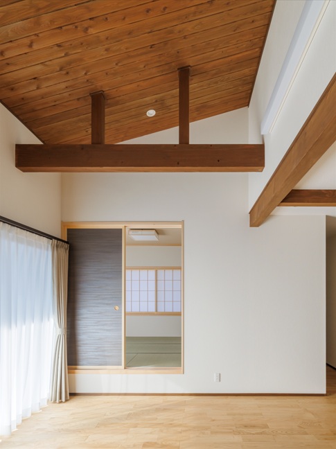 リビング部分を勾配天井にし、さらに開放感を演出。「木の家」の心地良い上質な住空間。