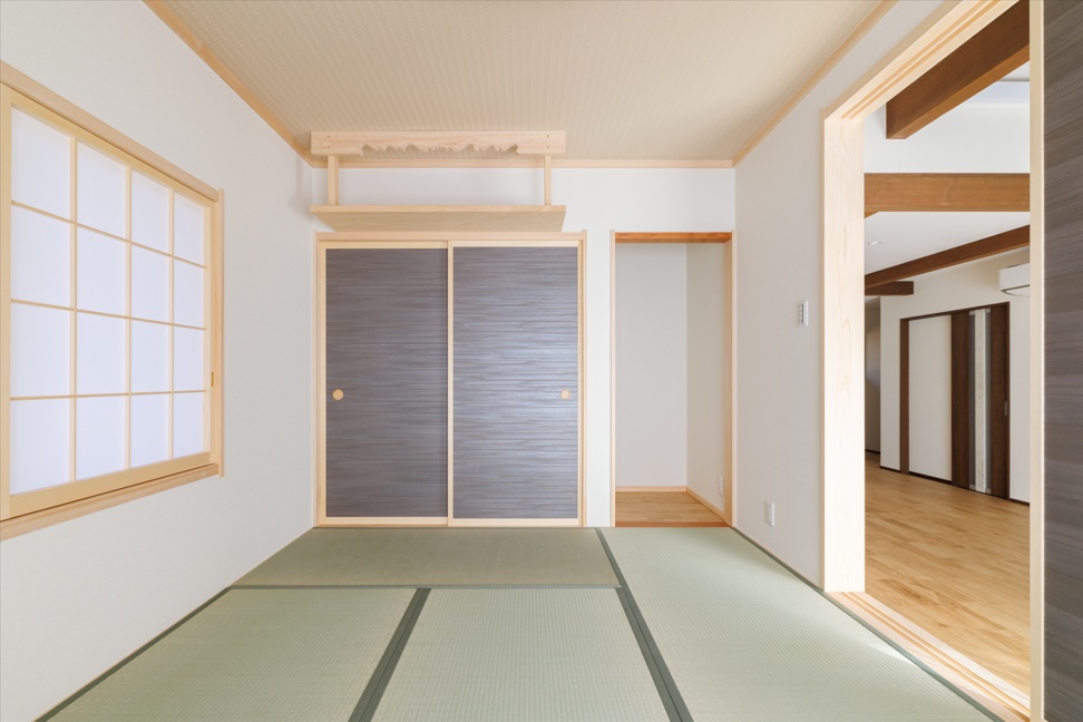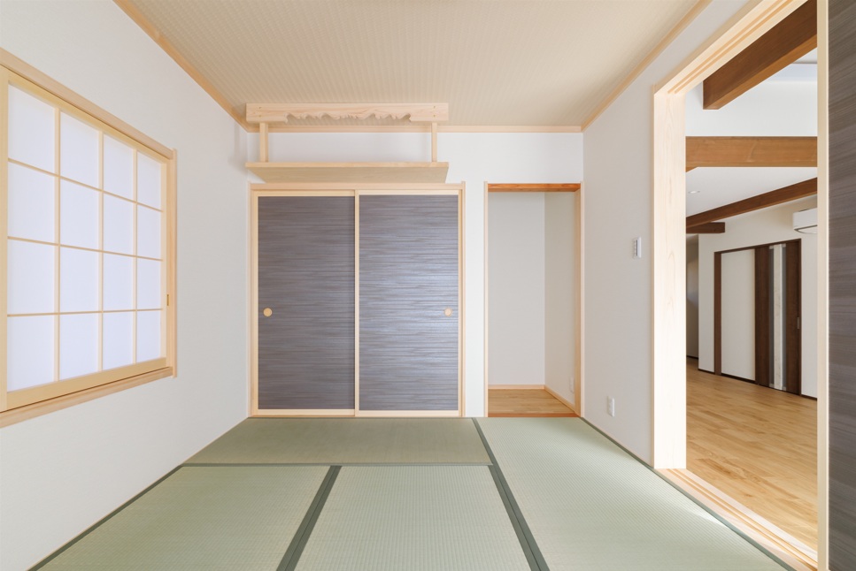 リビングから繋がる小上がり和室。襖を開けておくと腰を下ろせたり、ちょっとした休憩スペースに。閉めると寛ぎの場としても、来客スペースとしても使える畳の心地良さを感じる一室へ。